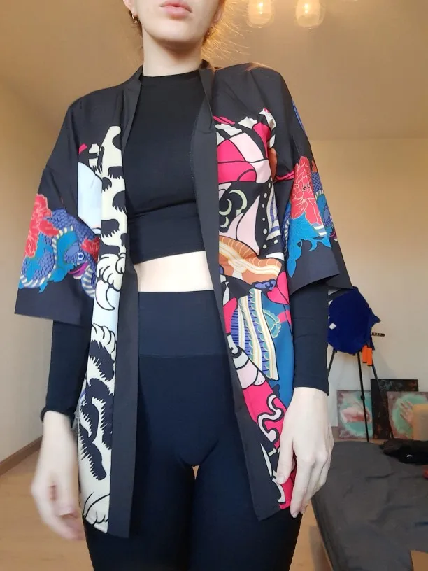 Отличное кимоно. Принт яркий, размер указан верно, нитки не торчат – ну за такие деньги золото.