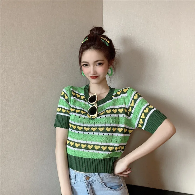 Женский полосатый свитер с коротким рукавом, зеленый укороченный тонкий ажурный свитер с круглым вырезом, пуловер, укороченный Топ для женщин