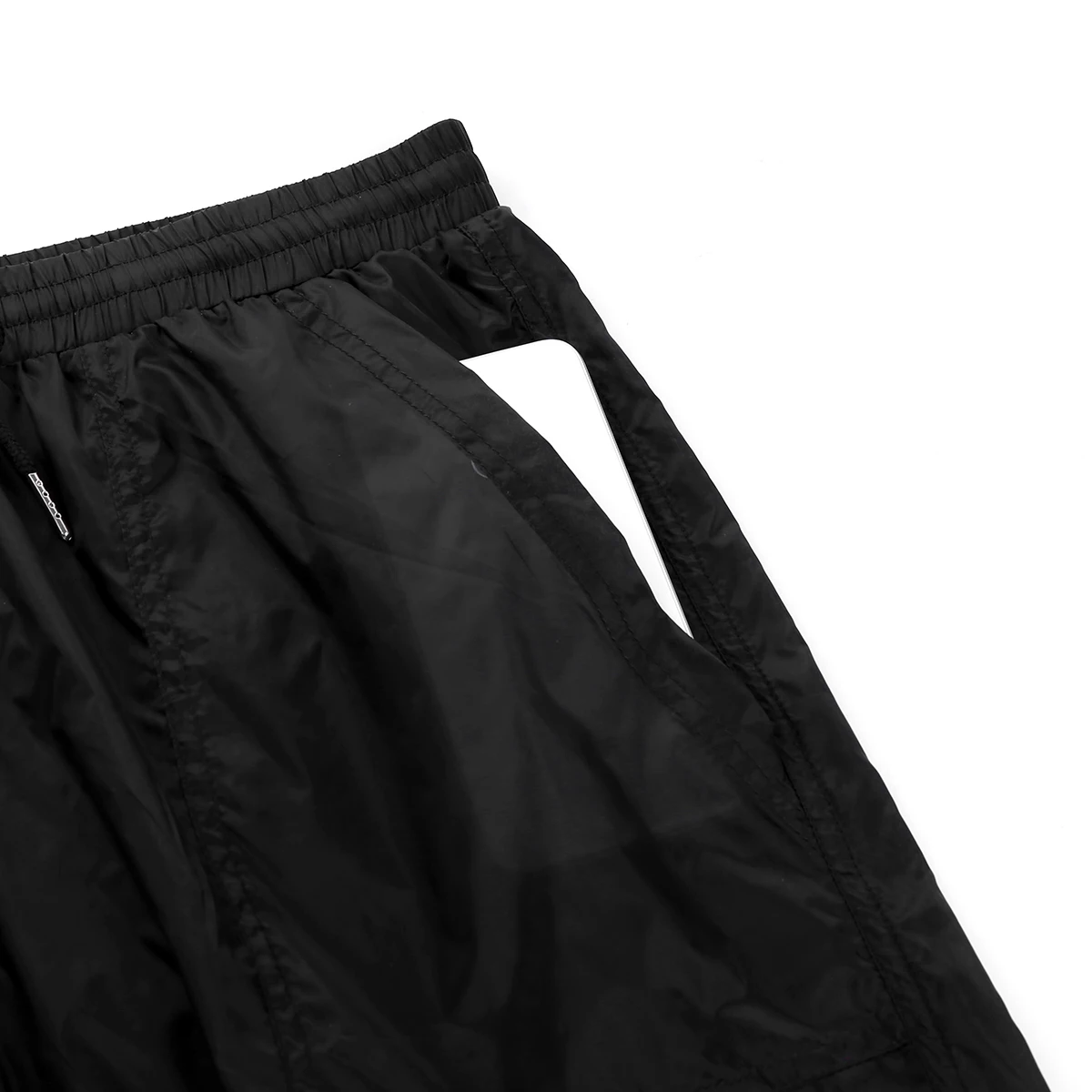 Широкий эластичный пояс с регулируемым шнурком, небольшой карман на талии и два боковых кармана, сетчатые трусы.