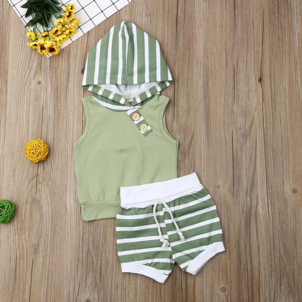 Комплект из 2 предметов, Одежда для новорожденных девочек и мальчиков, топ в полоску с капюшоном, короткие штаны, летние комплекты одежды, 2019