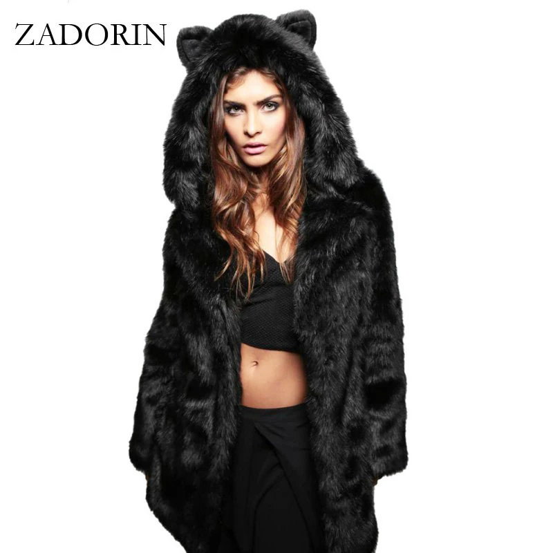 ZADORIN модная зимняя женская шуба из искусственного лисьего меха с капюшоном с кошачьими ушками, Толстая теплая черная куртка с длинным рукавом из искусственного меха, жилет, одежда