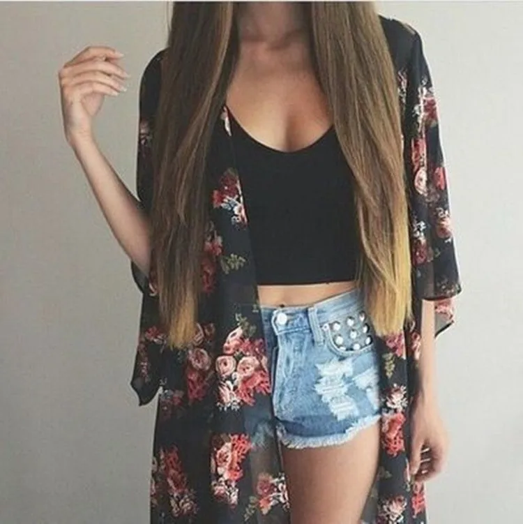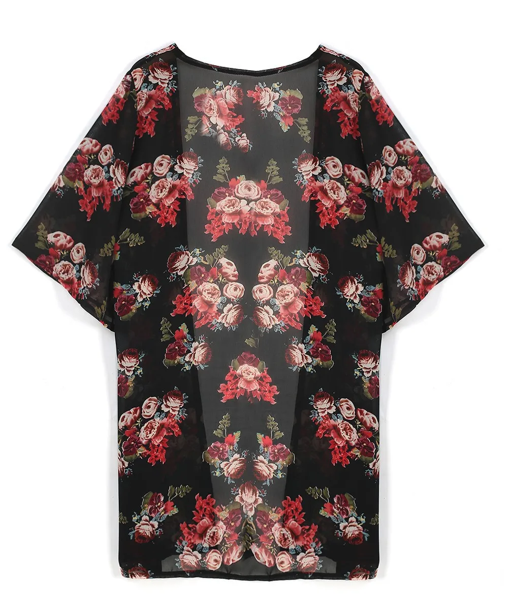 Женское повседневное винтажное кимоно, кардиган, женская летняя Длинная вязаная шифоновая кимоно preto, свободная блузка с цветочным принтом, топы черного цвета