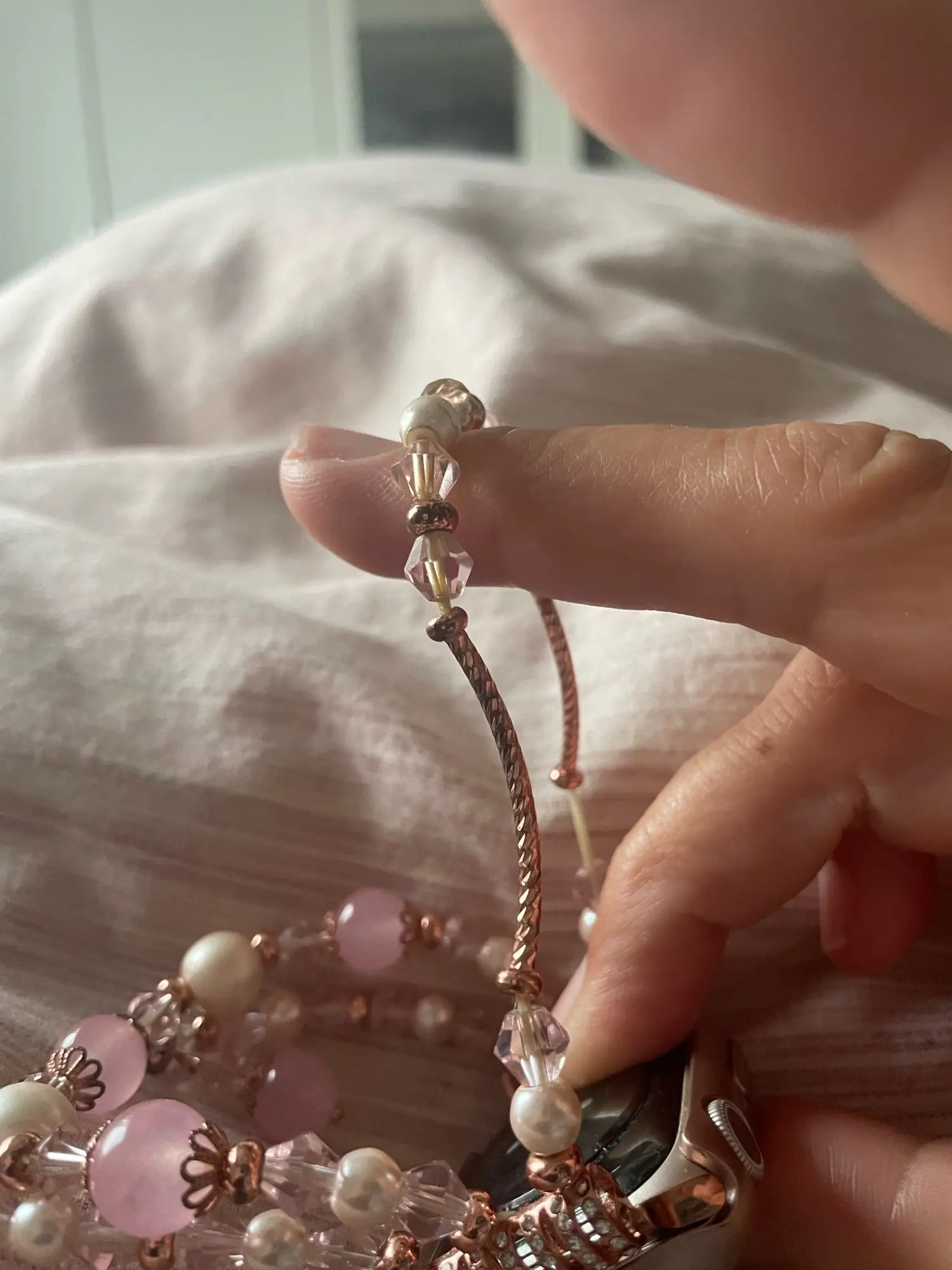 Поначалу браслет выглядел хорошо, но через несколько коротких дней резинка на ремешке полностью износилась, а жемчуг/звенья потеряли цвет. Он никогда не соприкасался с водой и все равно терял свой розовый цвет. Я определенно хочу вернуть товар, чтобы получить возмещение.