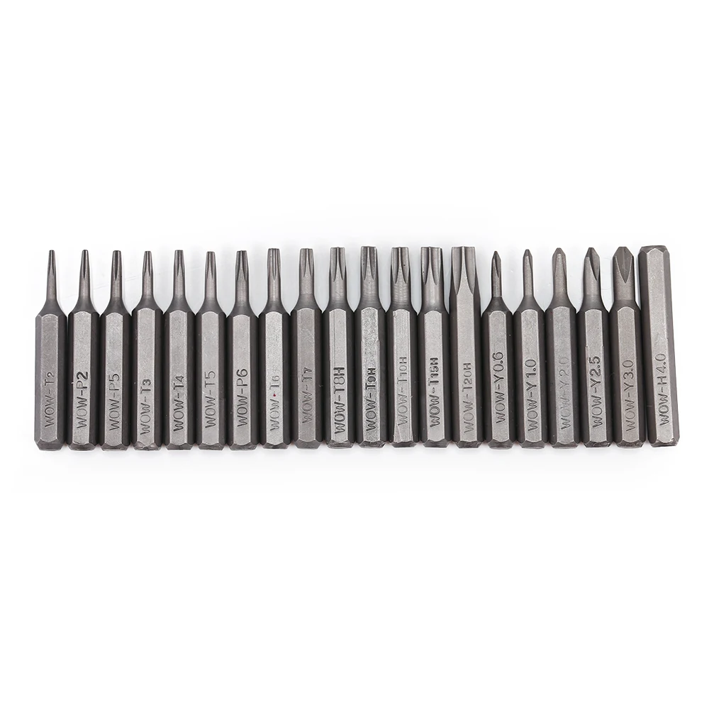 Это оригинальная Wowstick электрическая отвертка бит. Подходит для отверток Wowstick серии, отверток других марок и т. Д. Особенности:-Изготовлен из легированной стали S2 с высокой твердостью, высокой износостойкостью.-Размеры винтовых бит 4x28 мм 4x45 мм отвечают различным требованиям ремонта.-Идеально подходит для фиксации часов, ювелирных изделий, очков, небольших приборов и прецизионных приборов. Посылка в комплект входит:X1:20 штукPhillips: PH0000 / PH000 / PH00 / PH0 / PH1 / PH2Прорези: SL1.0 / SL1.5 / SL2.0 / SL2.5 / SL3.0 / SL3.5 / SL4.0Шестигранный: h0,7/h0,9/H1.3 / H1.5 / H2.0 / H2.5 / H3.0 X2: 20 штукБолты с шестигранной: H4.0Torx: T2 / T3 / T4 / T5 / T6 / T7 / T8 / T9 / T10 / T15/ T20Pentalobe: P2 / P5 / P6Тип Y: Y0.6 / Y1 / Y2.0 / Y2.5 / Y3.0 X3: 16 штКвадрат: S0 / S1 / S2Треугольники: 2,0/2,3/2,5/3,0U-Тип: U2.0 / U2.6 / U3.0Иглы: 0,8Ш: 1,5Удлинение 45 мм бит: PH0 / PH2 / SL2.0 / H2.0