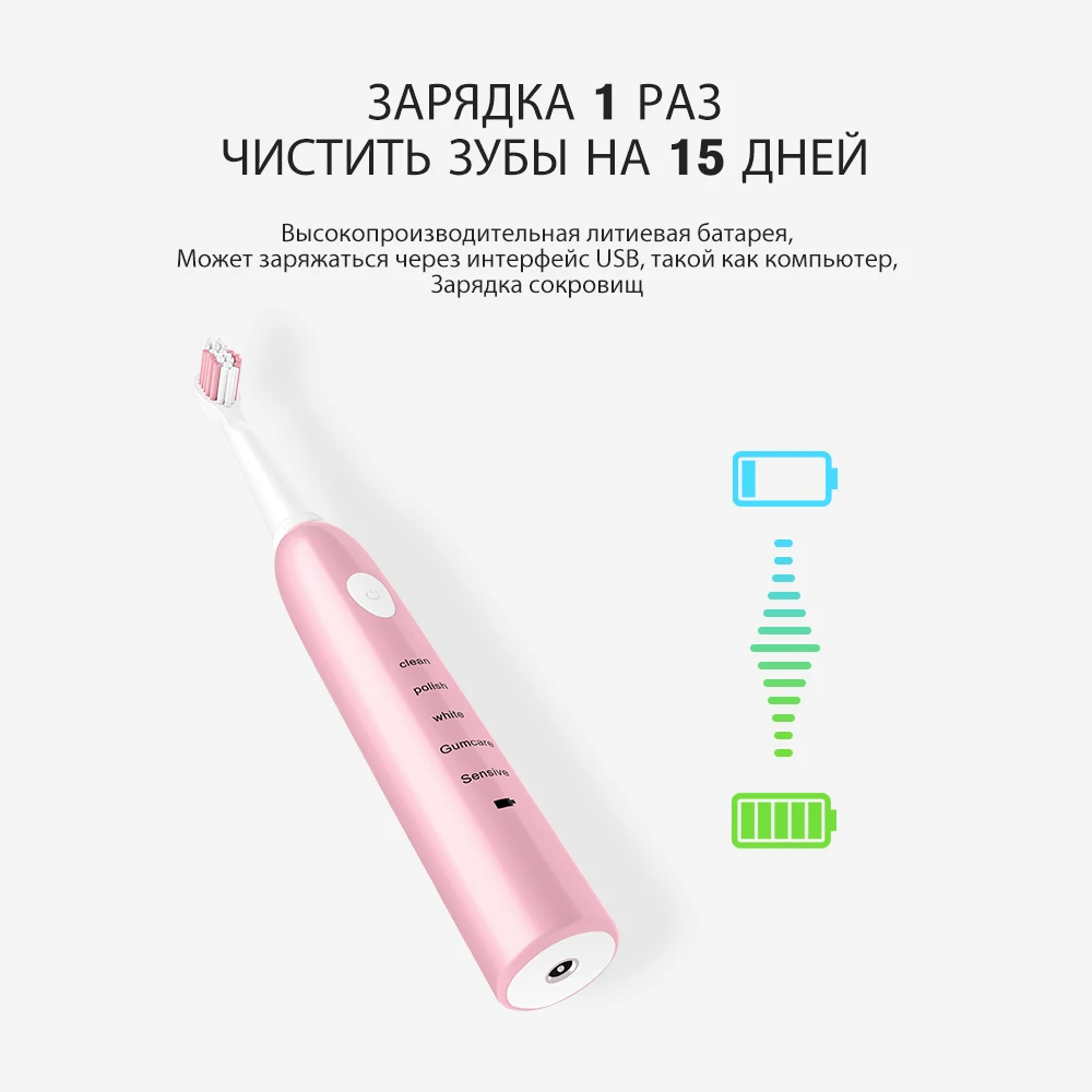 Материал: АБС-пластика/ТПЭ/зубная щетка из нейлона DuPont щетина Режим зарядки: 5V-USB зарядки Напряжение: 3,7 V Мощность: 0,5 W Пакет включает в себя: 1x зубная щетка 4 х штук головки зубной щетки 1 х USB Зарядное устройство