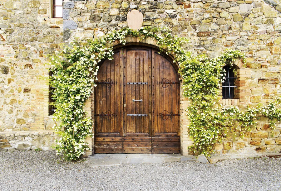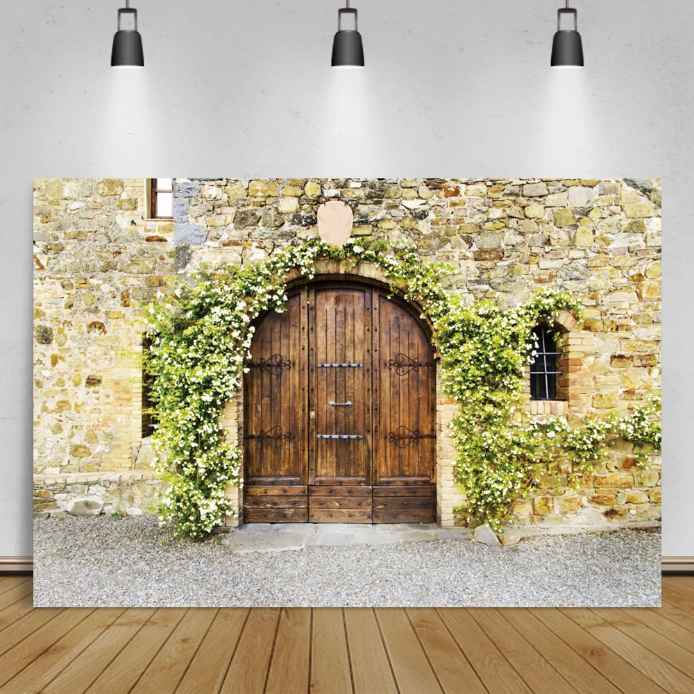 Фотофон старый в деревенском стиле каменный дом цветы венок на дверь порог, двор сцена фотографический фон фотосессия Фотостудия