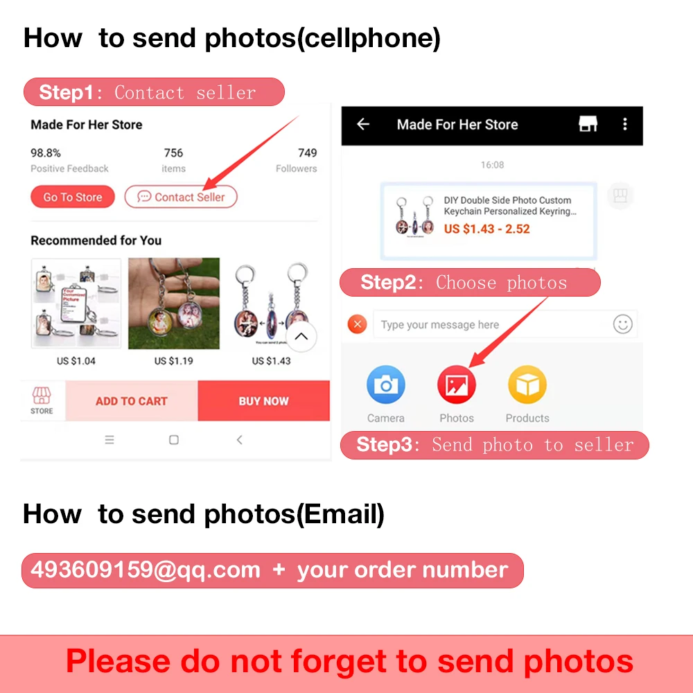 2. Как отправить фотографии по электронной почте?Адрес электронной почты: 493609159@qq.comФотографии (текст или логотип) + номер вашего заказа3.Как отправить фотографии, если мне нужно заказать более 1 двусторонний пользовательский брелок?Ответ:1 брелок может иметь 2 разных фотографииВот скриншот о том, как отправить фотографии