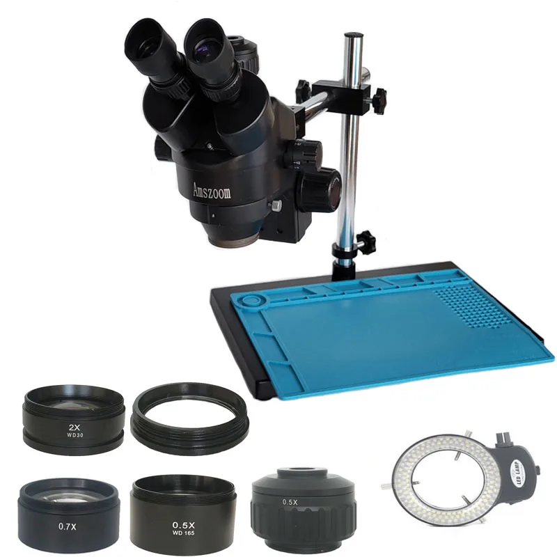 Большой стол с синим ковриком паяльный 3.5X-90X промышленный Тринокулярный стереомикроскоп 0.5X 2.0X вспомогательная линза объектива PCB инструменты