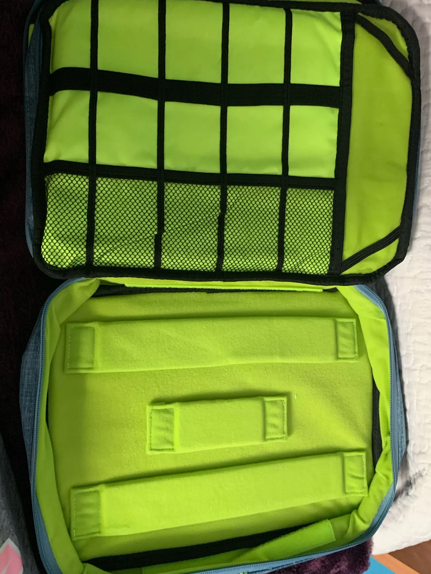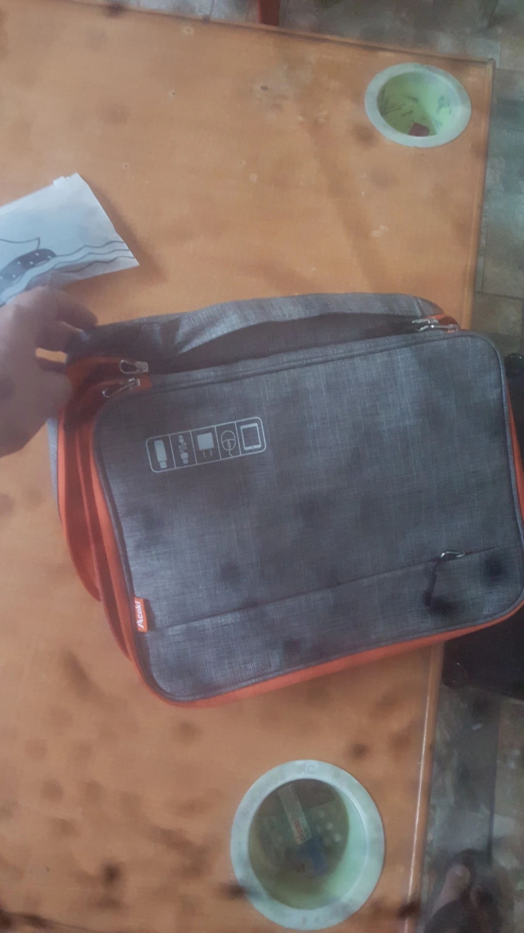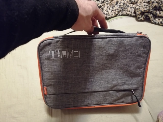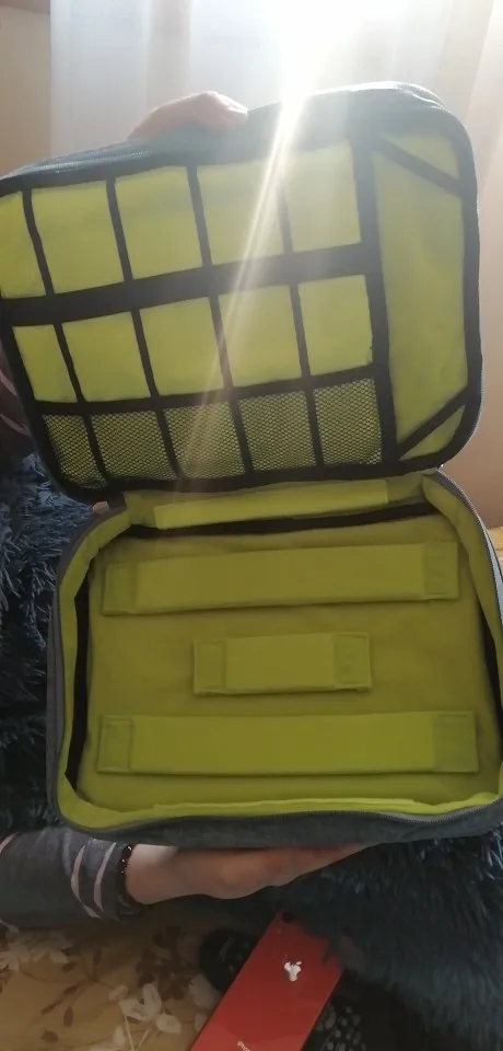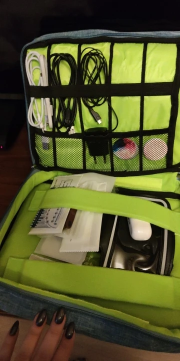 Сумка приехала очень быстро. Качество очень высокое. Нигде ничего не торчит. Отделений много, может поместиться практически вся мелкая электроника и куча проводов к ней. Рекомендуется для удобного хранения проводов!