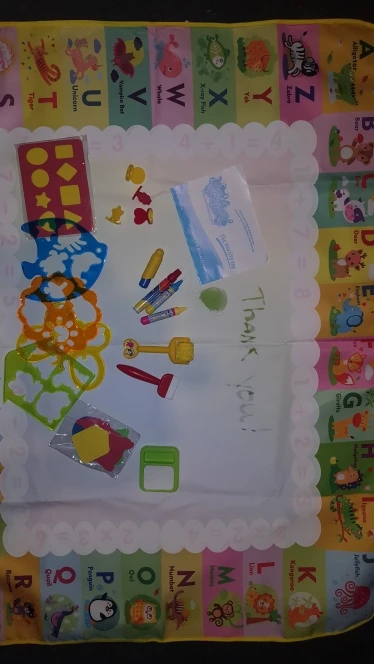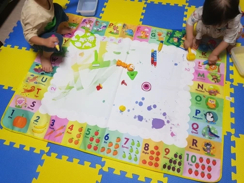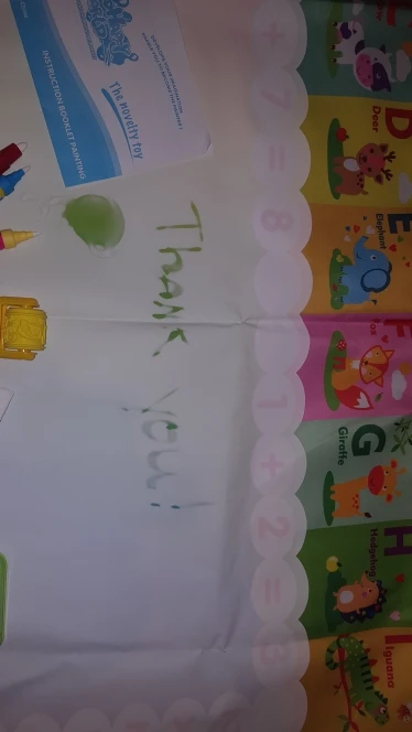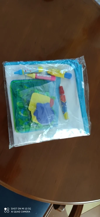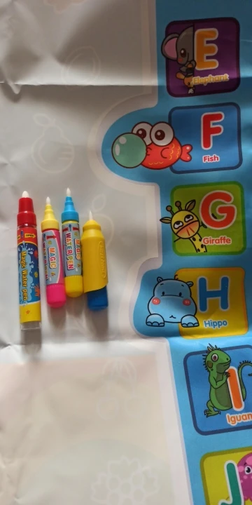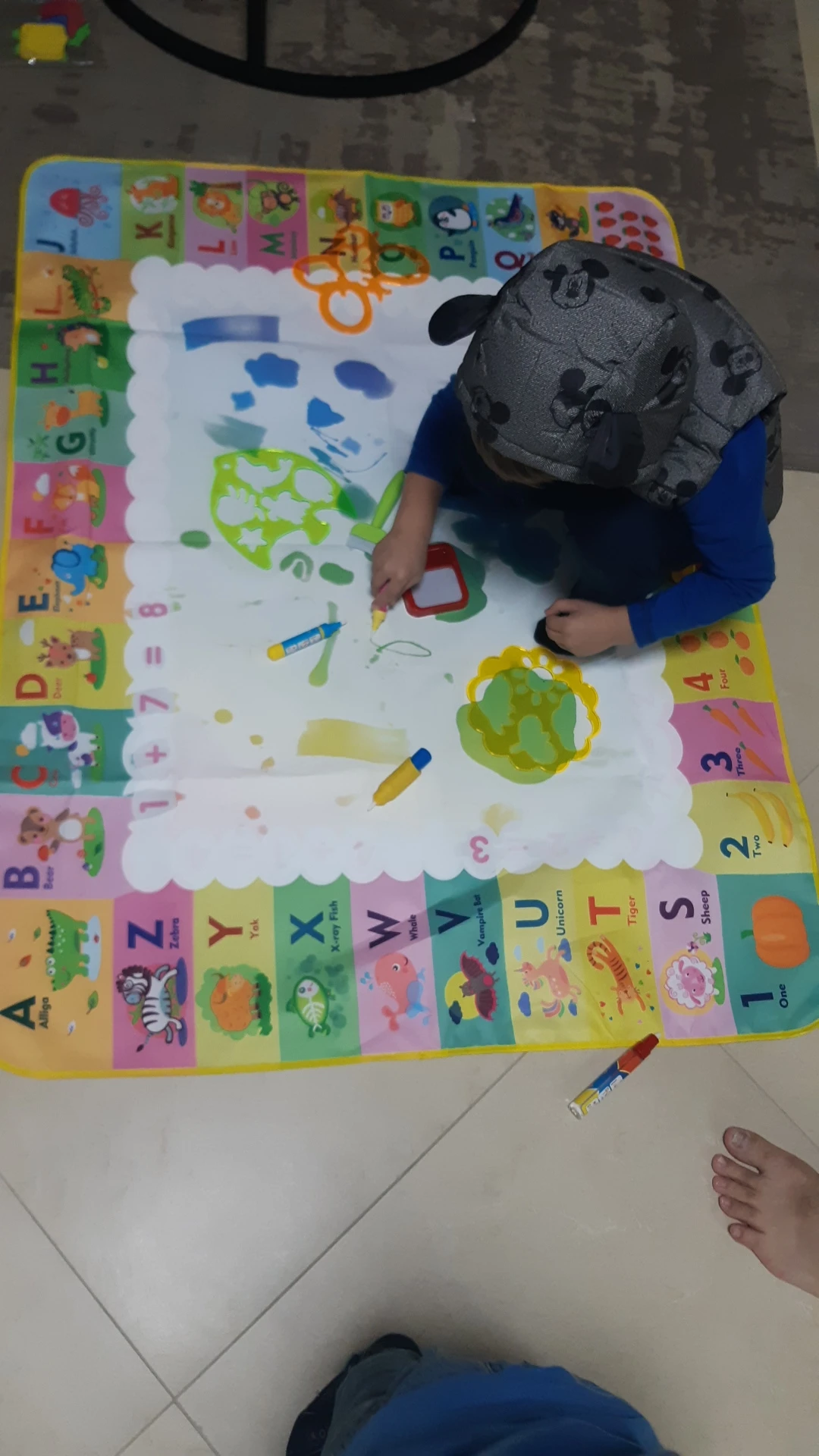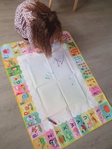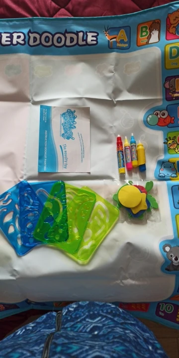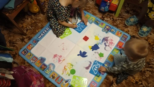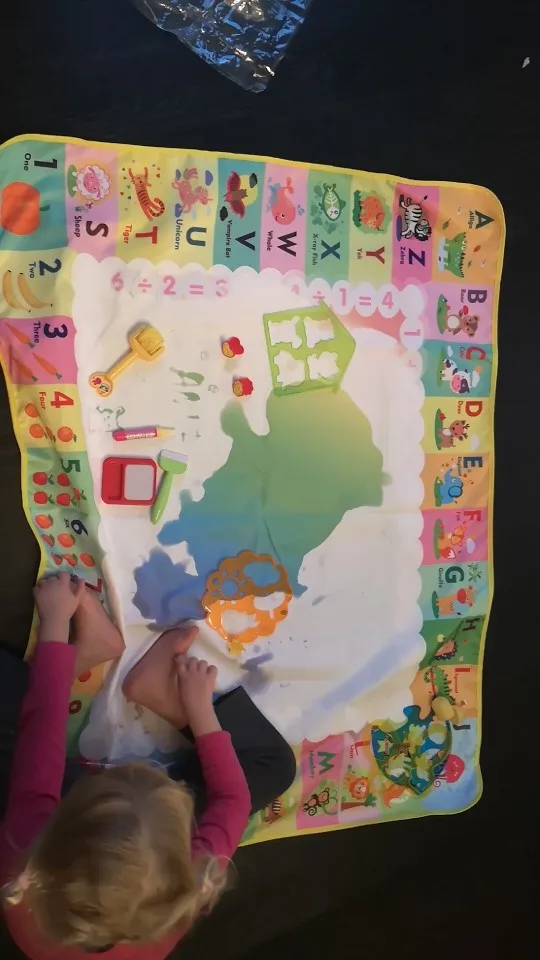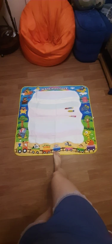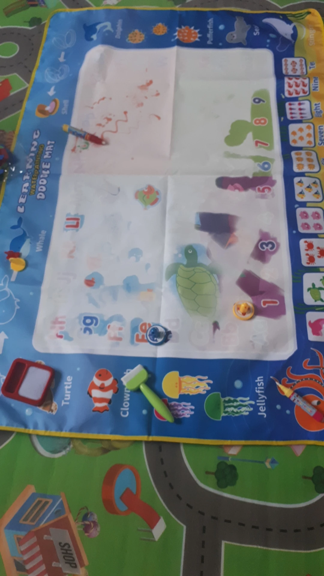Чудесный коврик дли рисования. Весь процесс происходит с помощью воды, поэтому запачкать ничего не возможно. Коврик не промакаемый, поэтому, даже если ребёнок что-то прольёт, всё остоётся там же. После высыхония, рисунки пропадают, и можно начинать рисовпть с чистого полотна. В комплекте много разных кисточек и фигурок, чтобы процесс был разнообразным и интересным. Всё очень качественно. Доставка супер быстрая. По периметру коврика алфавит и цыфры, а так же простые арифметические примеры, которые появляются после того, как их намочить.