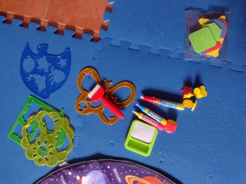 Очень хороший коврик, ребёнку нравится, очень много приспособлений( штампы, линейки и тд).