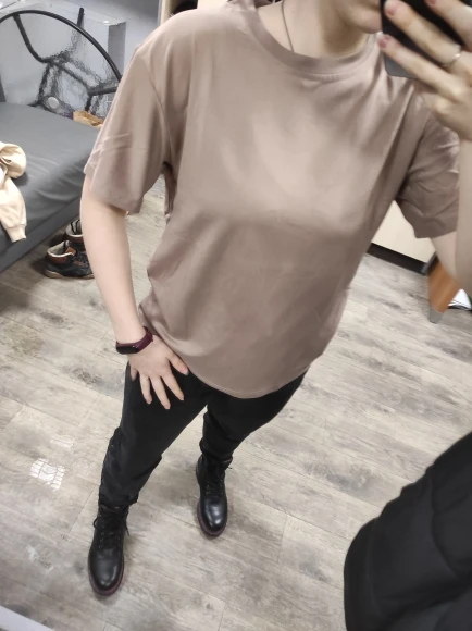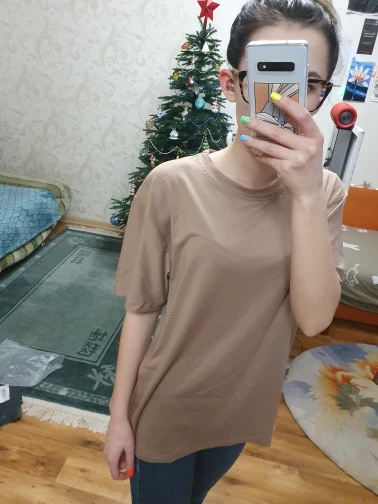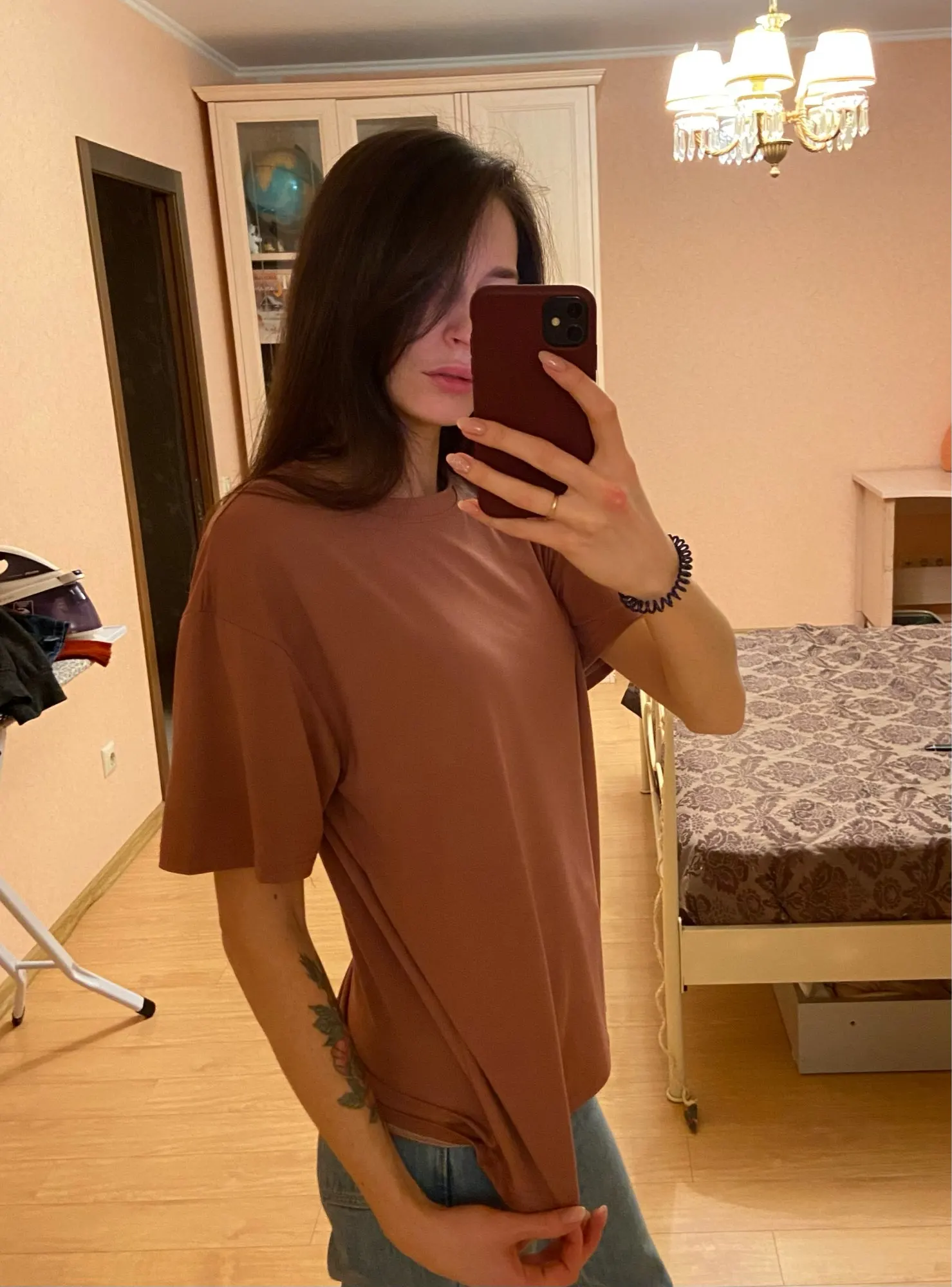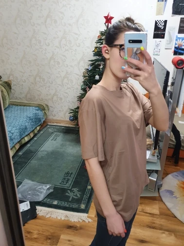 Отличная футболка, прекрасная по качеству и вообще всем советую, правда на мой S я заказала себе оверсайз M то футболка мне как раз, так что если хочется свободную футболку то берите на 2 размера больше, пришло не очень быстро, цвет максимально близок к фотографиям