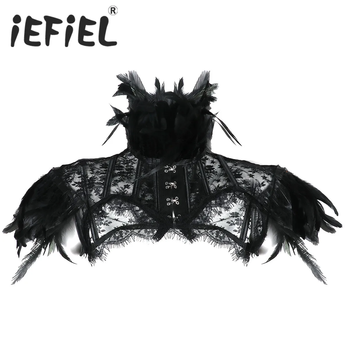 Накидка-Болеро женская кружевная, в готическом стиле, с перьями, воротником и плечами, топы, костюмы для Хэллоуина, накидка, Ретро винтажный панк