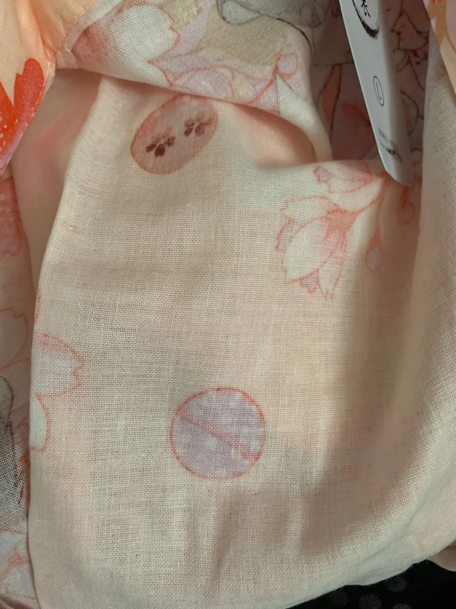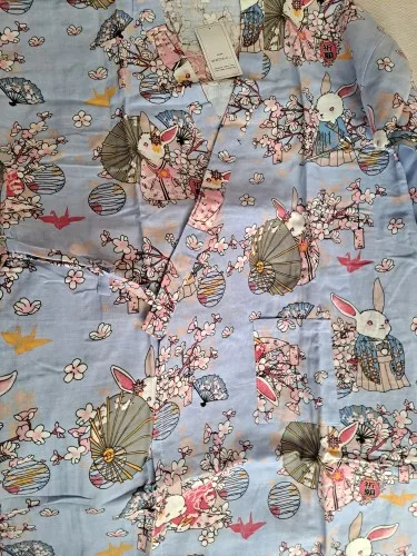 Как многие уже писали, есть запах. Х) Не ожидала, что ткань будет такой грубой, но выглядит симпатично за счёт узора. Рисунок хорошо нанесён, аккуратно и ярко. Пока что носила только дома во время примерки, потом, думаю, после стирки будет лучше. Как обычно долго разбиралась с верёвочками.:D