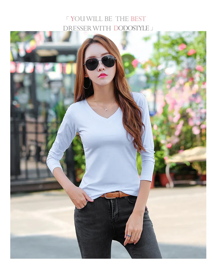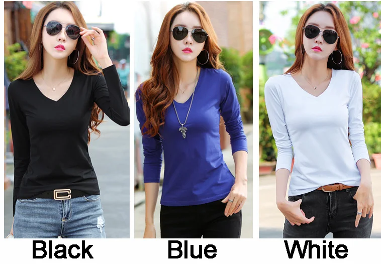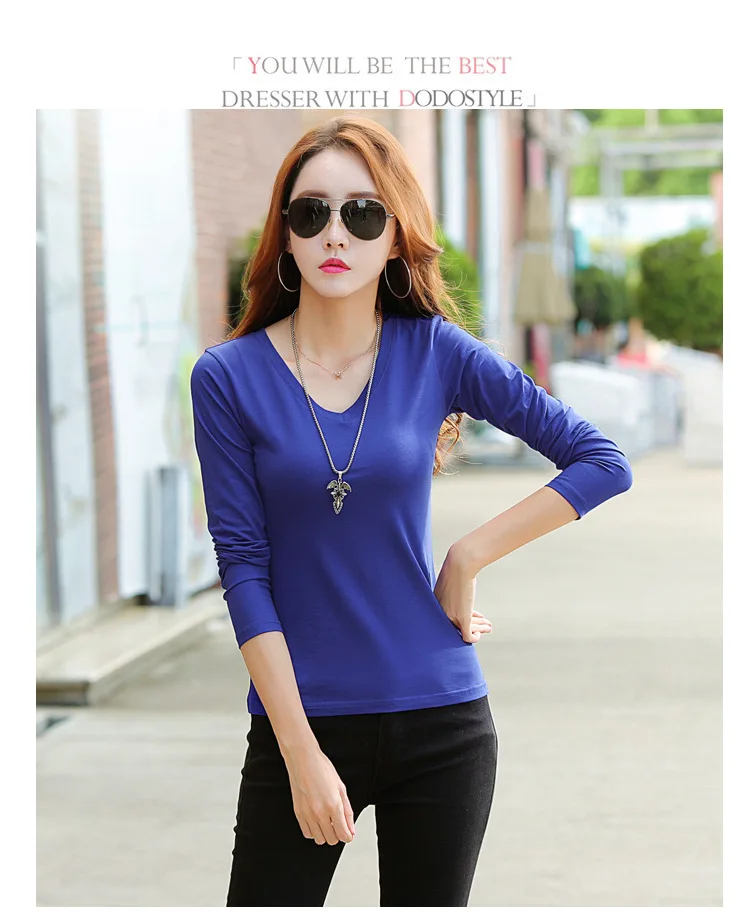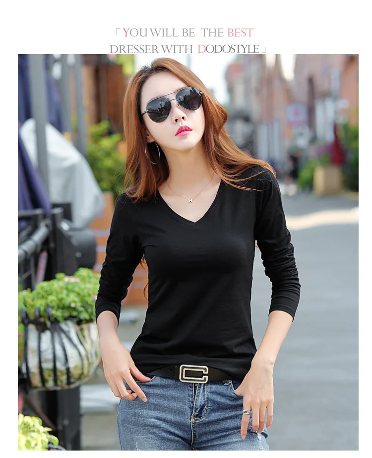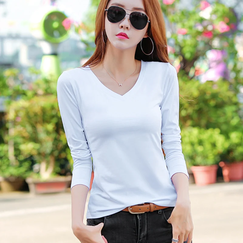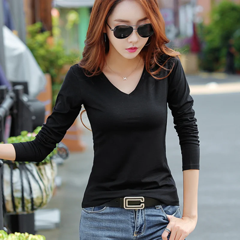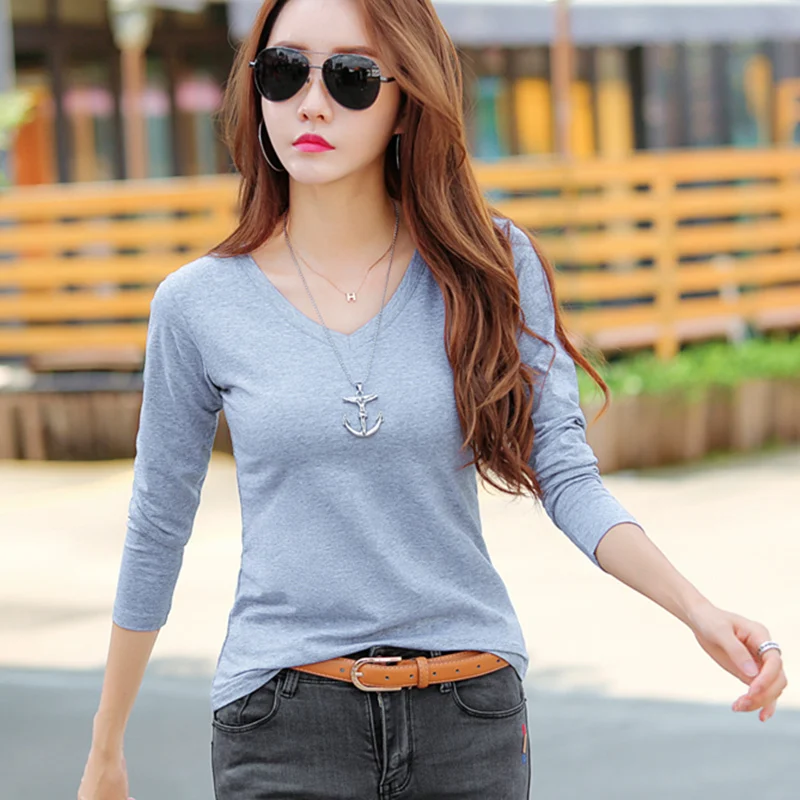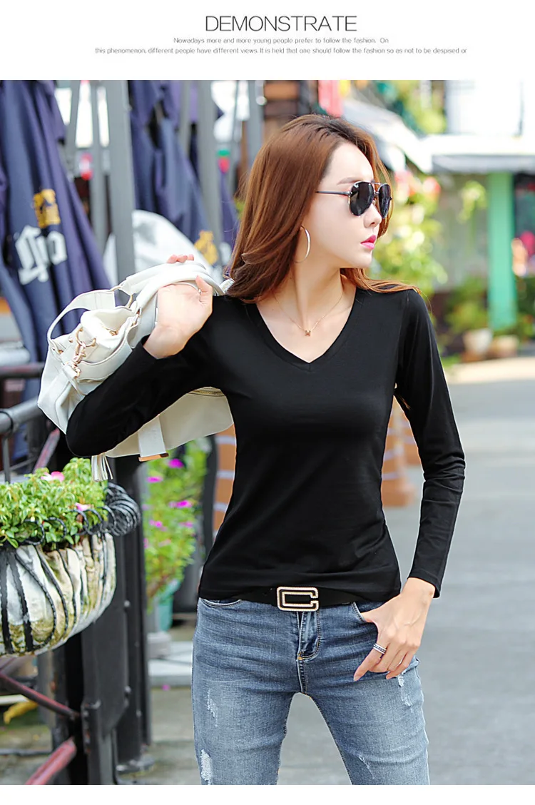 Футболка женская 2019 Осенние футболки с длинным рукавом и v-образным вырезом женские хлопковые футболки ярких цветов женские футболки Новая мода