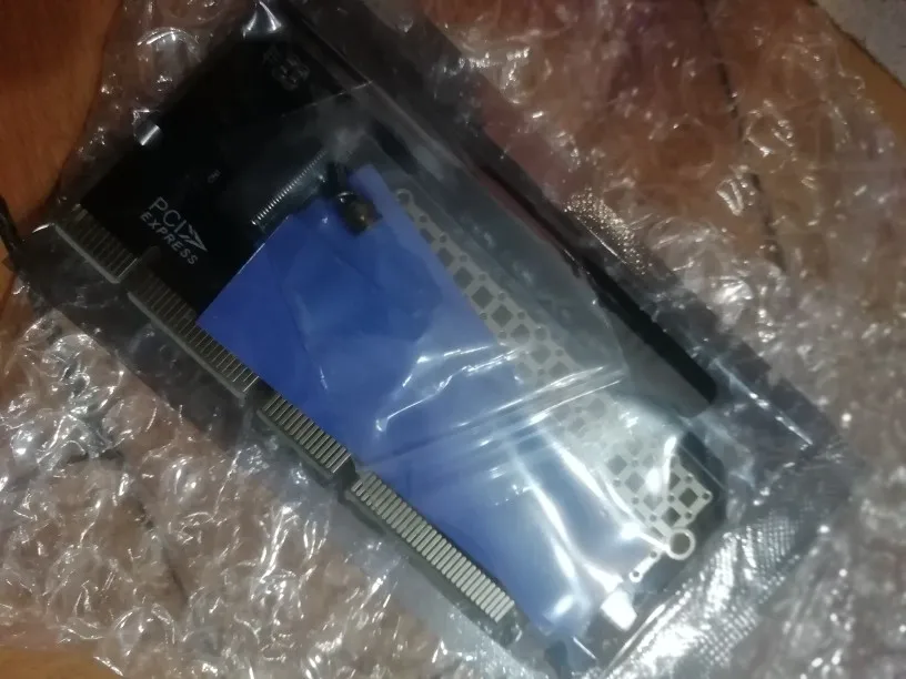 Доехали быстро.Уже заказывал ранее такие же, мне они понравились, плотно сидят в слоте х16. В комплекте термо-прокладки (раньше было 3 светлоголубые , сейчас более синие и на вид качество похуже, в деле надо проверять) В комплекте болты, отвертка.Сама плата толстый текстолит. Есть светодиодная индикация активности голубым цветом снизу моргает.