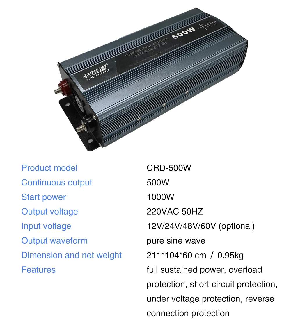 Входное напряжение: 12 В/24 В/48 В/60 В постоянного токаВыходное напряжение: 220 В 50 ГцПиковая мощность: 1000 ВтМощность suatain: полная 500 ВтТип волны: чистая Синусоидальная волнаРазмер: 21,1 см * 10,6 см * 6 смДлина нетто: 0,95 кг