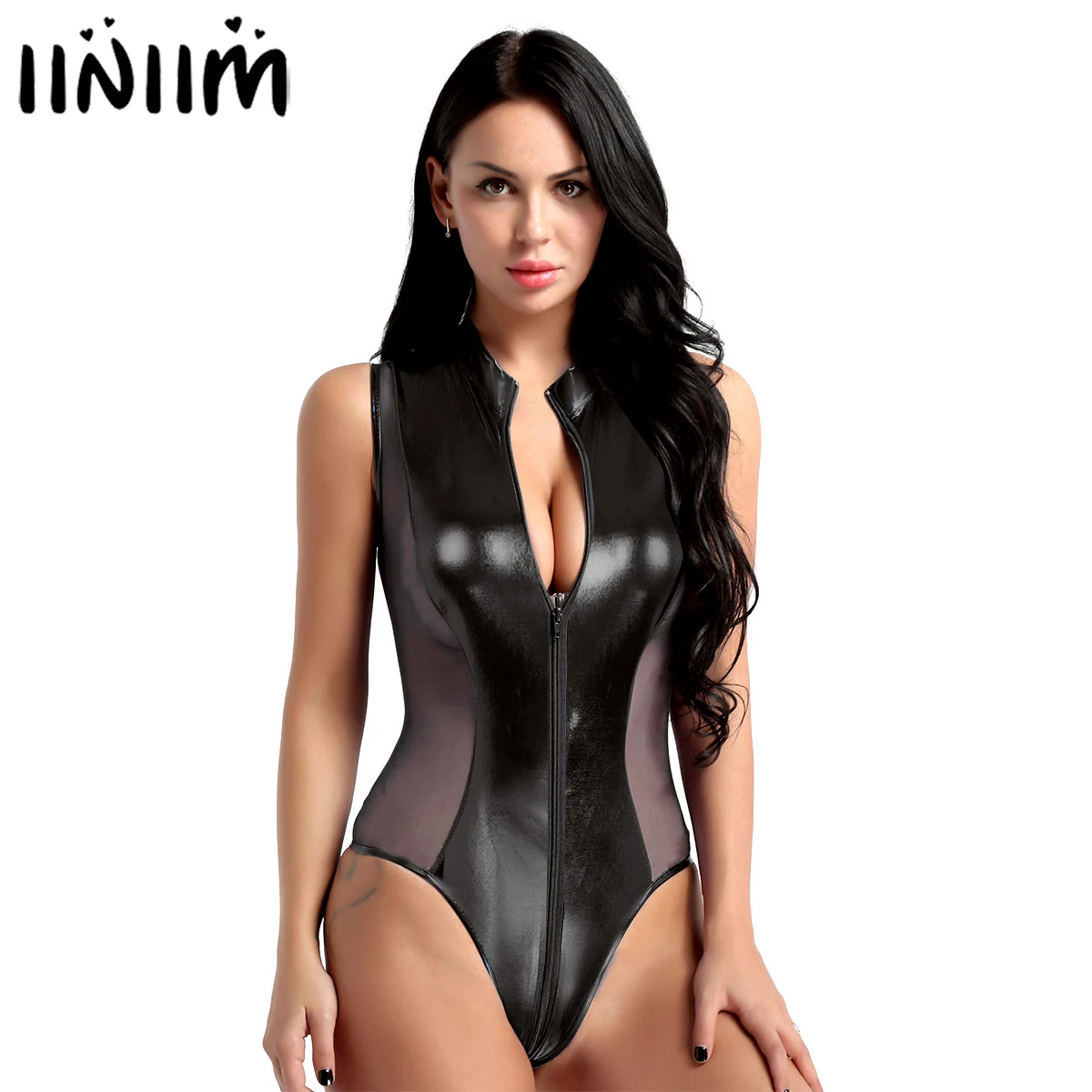 Iiniim Женская лакированная кожа, модная Клубная одежда, костюм-кошка, блестящий металлический Прозрачный сетчатый комбинезон на молнии, стринги с высоким вырезом, трико, боди