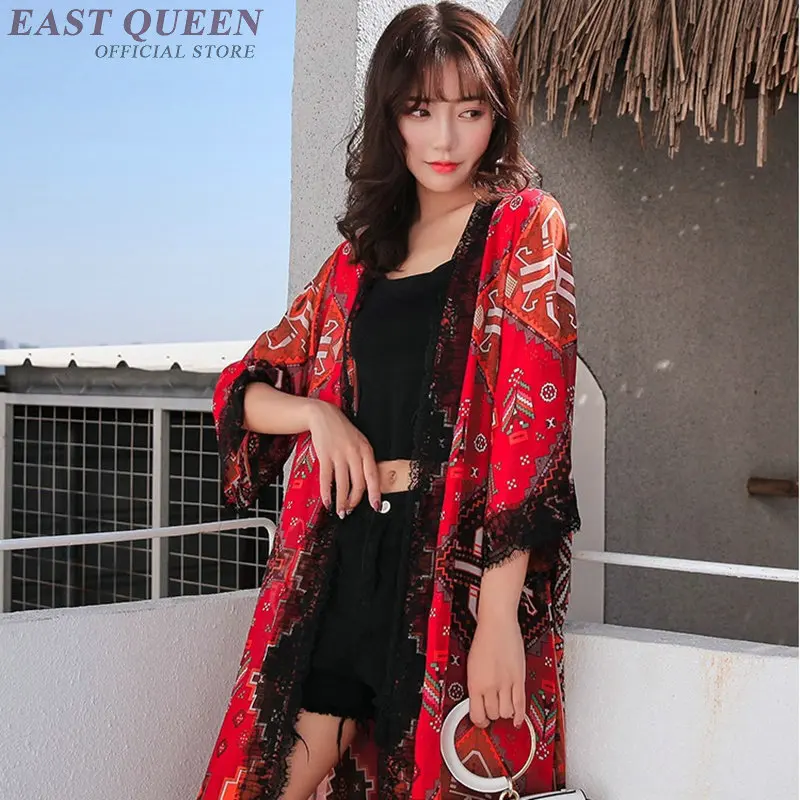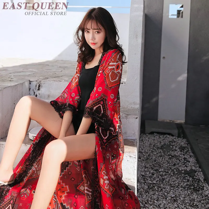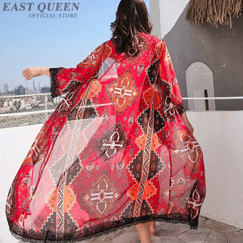 Красное пляжное кимоно, кардиган, Солнцезащитная женская блузка в стиле бохо, женские топы с мексиканским принтом, летняя длинная рубашка, AA4820, 2019