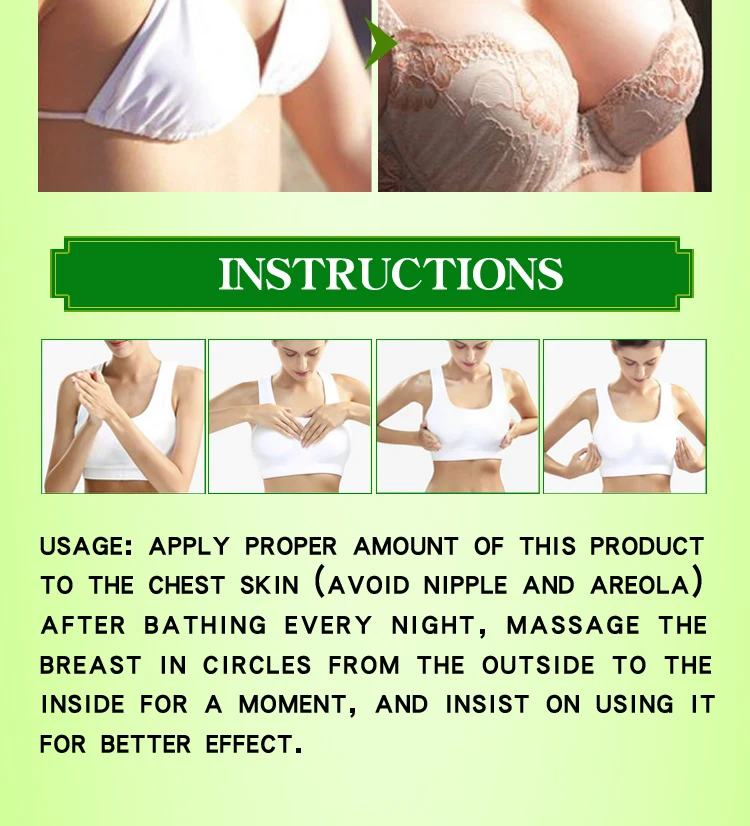 1. Нанесите необходимое количество этого средства на кожу груди (Избегайте сосков и араолы) после купания каждую ночь.2. Массируйте грудь в кругах от внешней стороны до внутренней, и Настаивайте на использовании для лучшего эффекта.