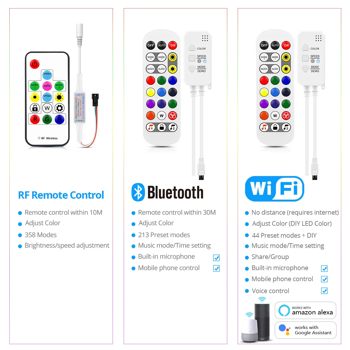 Характеристики:Тип товара: пиксельный RGBIC светодиодный ленточный светильникТип светодиодный: WS2811 5050 RGBIC SMD (индивидуально адресуемый светодиодный).Светильник, цвет s: полноцветный RGB, изменение цвета мечтыКоличество СВЕТОДИОДНЫЙ: 30 светодиодный s/MВодонепроницаемость: не-водонепроницаемый/водонепроницаемыйНапряжение: DC12VДлина: 1 м/2 м/3 м/4 м/5 мТип светодиодный: SMD5050 (внешний WS2811 IC, один IC контроль 3 светодиодный s)FPC ширина: 10 мм.Можно резать: 3 светодиодный.Bluetooth и WiFi контроллер встроены в микрофон, режим мульти музыки регулируется.Три способа управления для выбора:1) Пульт дистанционного управления RF/IR (без батареи CR2025 или CR2032).2) управление через приложение Bluetooth.3) WiFi Tuya Smart APP. Совместимость с Amazon Alexa и Google Assistant. После установки, Alexa/Google может действовать как ваш личный дворецкий, путем включения/выключения/затемнения вашей умной светодиодной ленты.Применение:WS2811 цветные полоски мечты могут быть использованы для телевизора, ПК фоновый светильник ing, отель, K телевизор, бар, игровая комната и другой досуг, украшение для развлечений, чтобы повысить атмосферу, шасси автомобиля, украшение автомобиля, украшение магазина, украшение дома и другие украшения. Светильник с яркой подсветкой, светодиодный светильник, трубка для домашнего декора шкафа