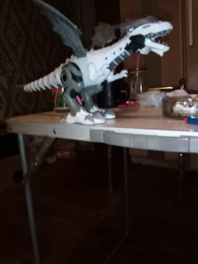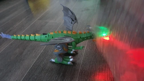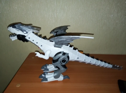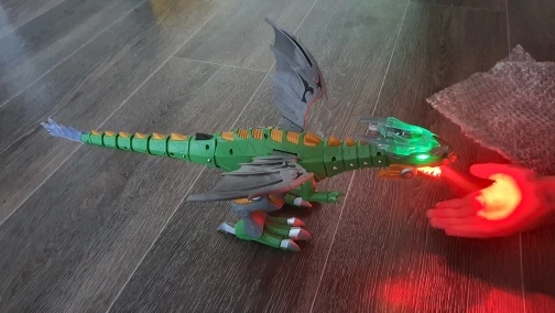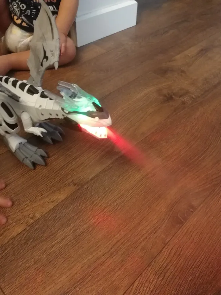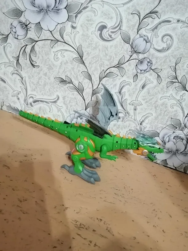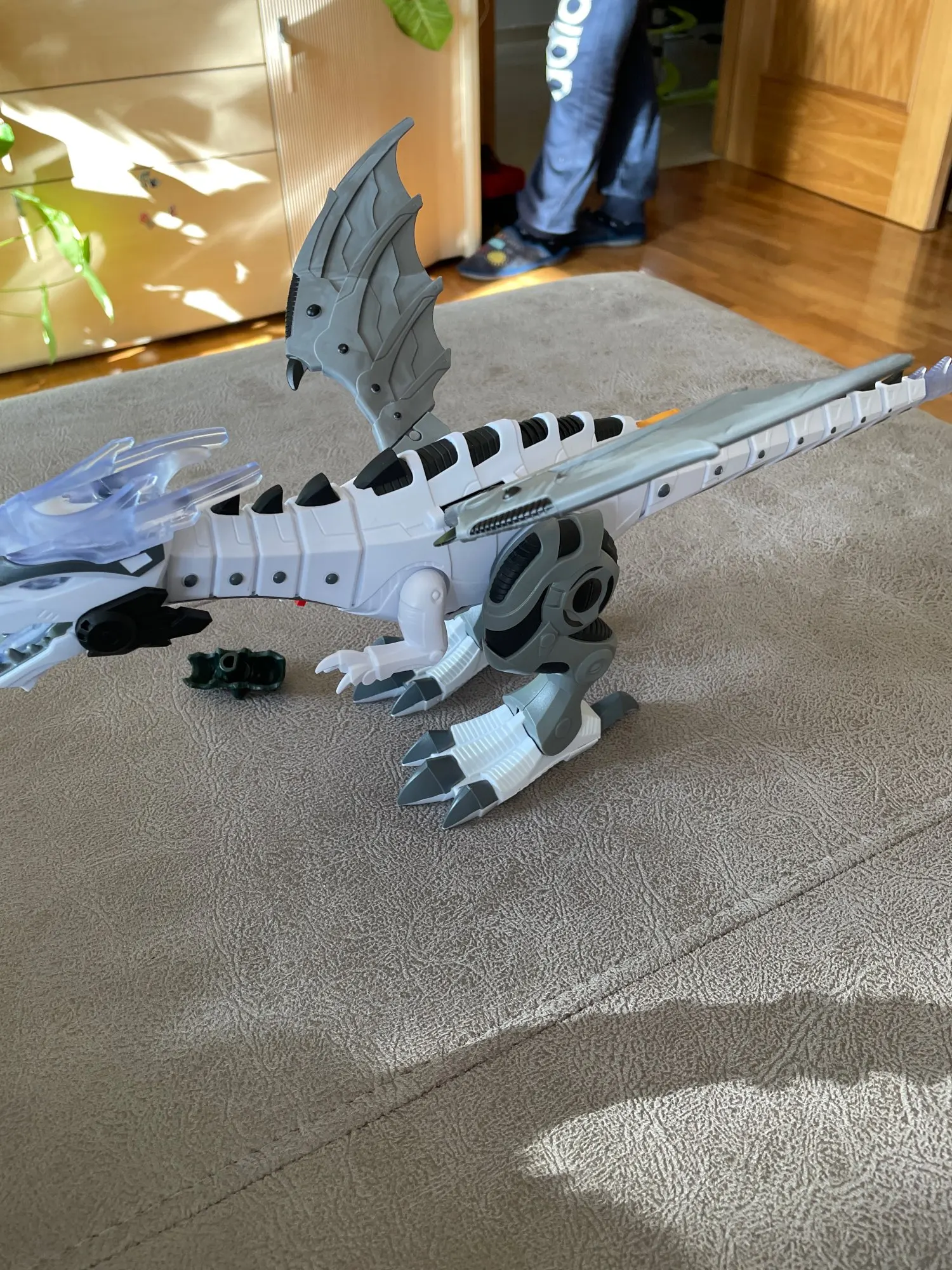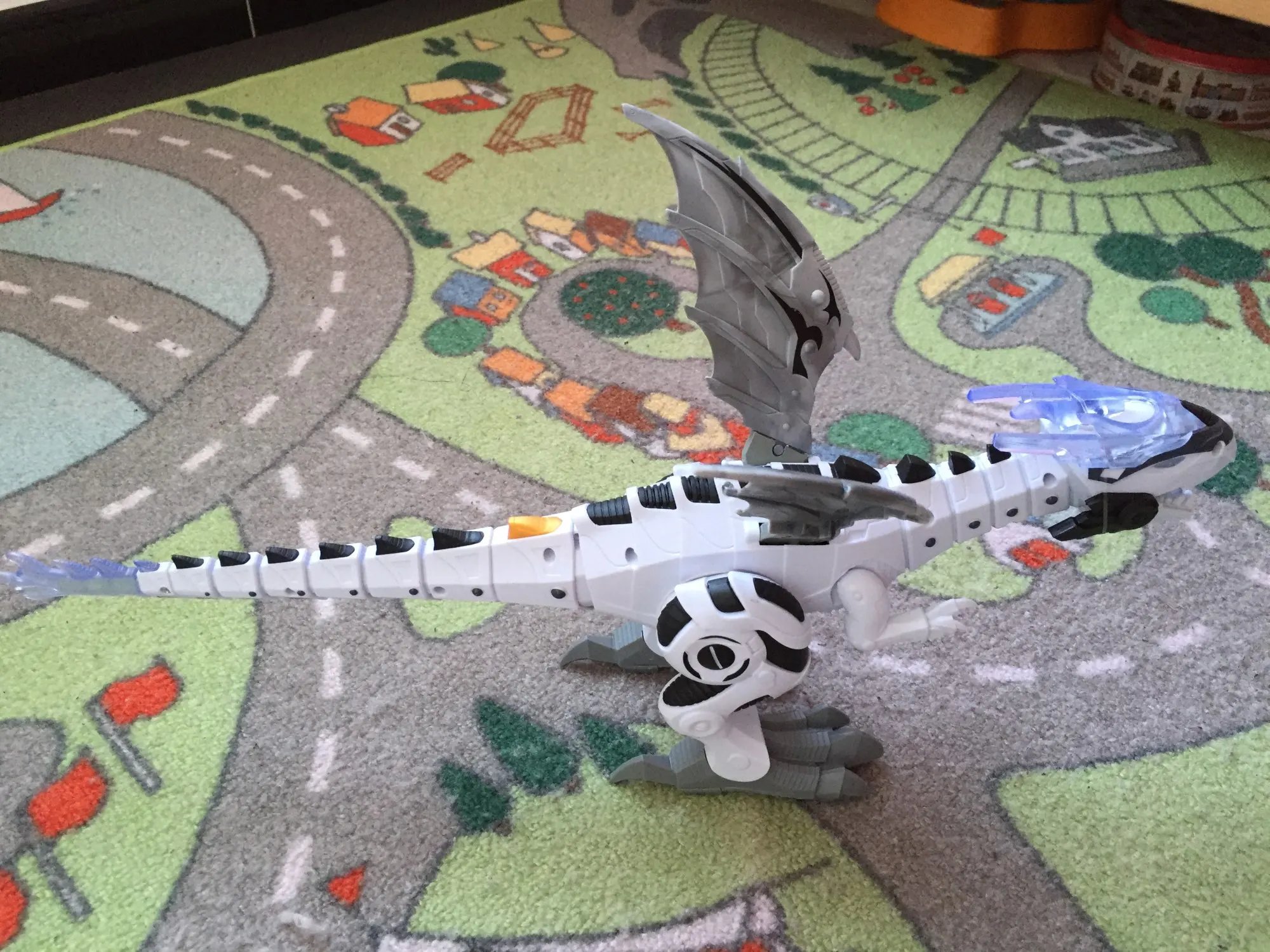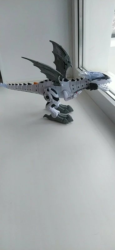 Робот потрясающий! Качественный пластик, ходит рычит кричит, в голову зашиваете водичку и дракон извергает паром подсвечивая это все лазером. Ребёнок в восторге!