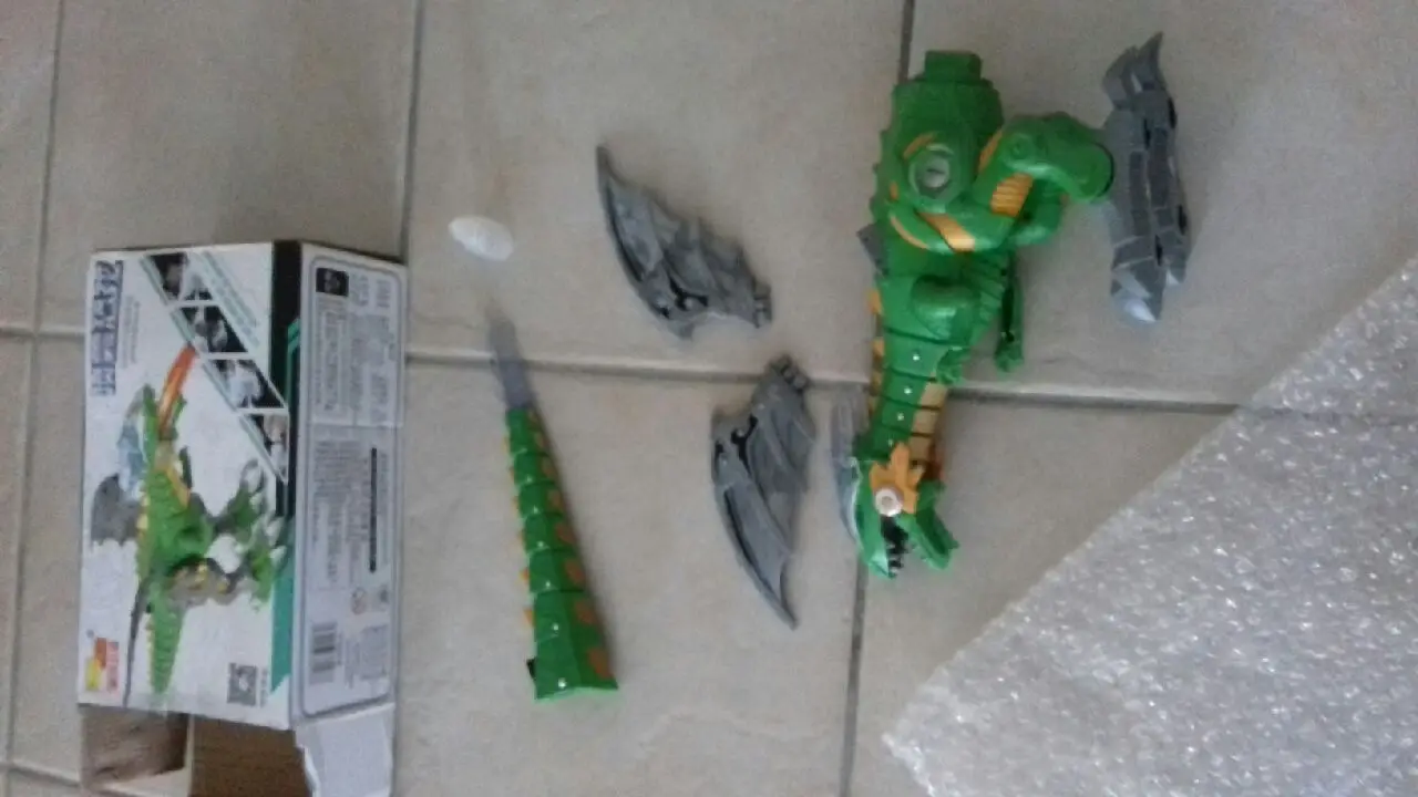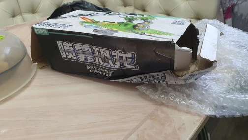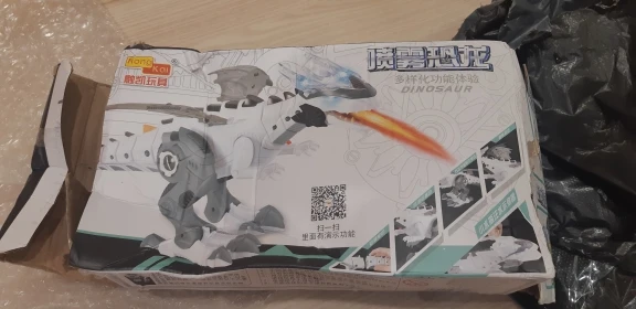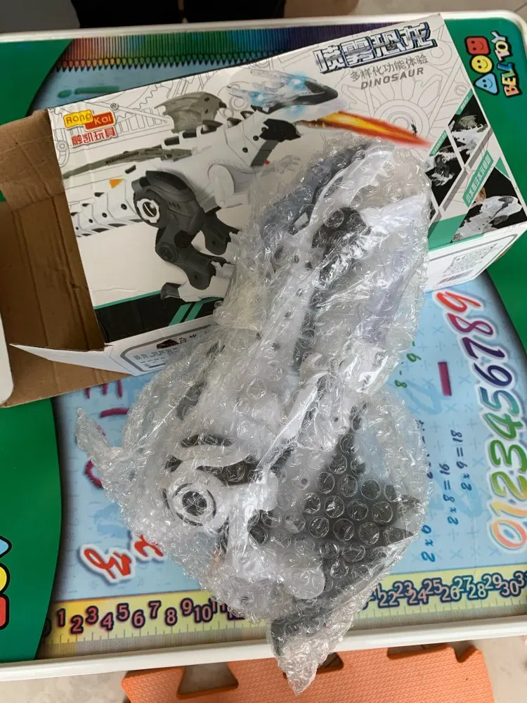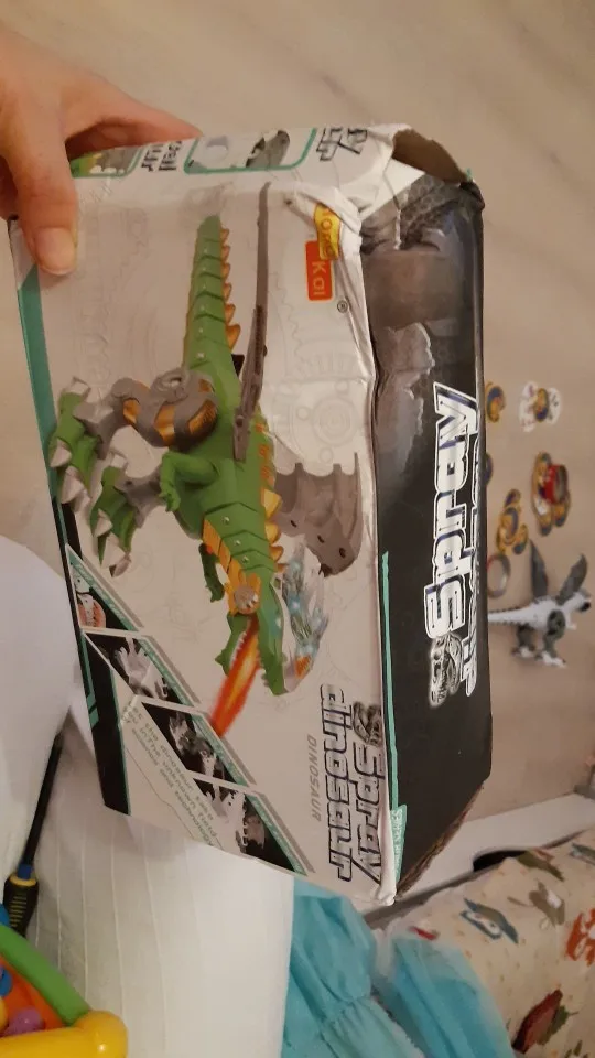 Коробка пришла помятая, хотя я и просила упаковать лучше, тк вещь на подарок. За это минус звезда. Пупырка в упаковке как будто уже была в употреблении-пузыри лопнувшие и на вид старая. НО игрушка целая, ходит, кричит, "огнём" дышит, крыльями и хвостом машет.. Тут без претензий. Фото упаковки.