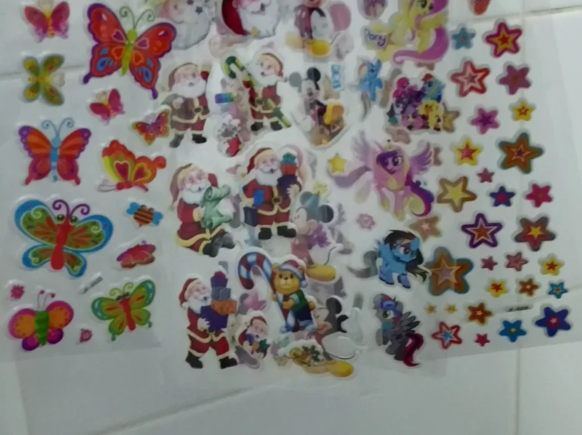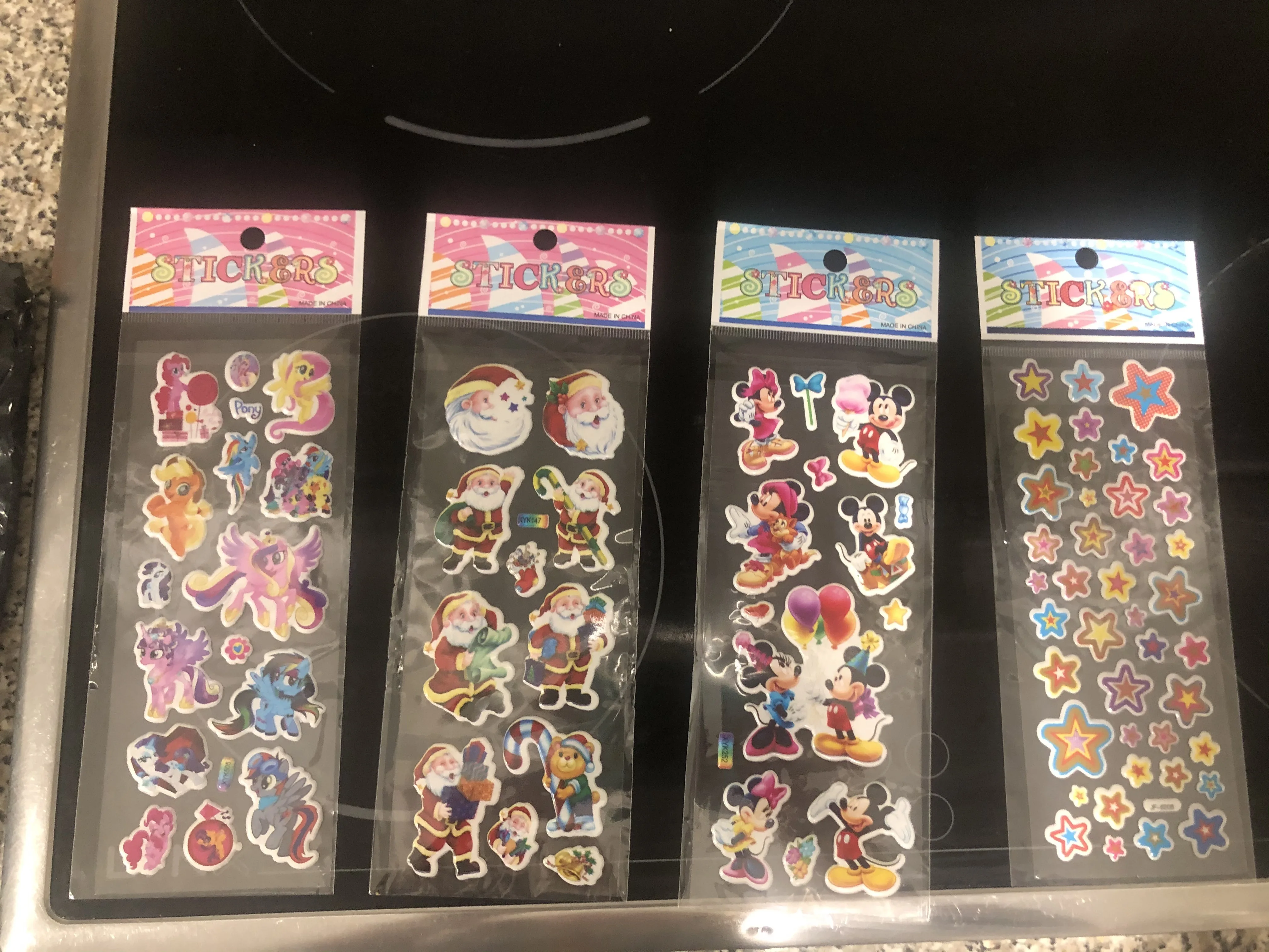 Разные наклейки. Мне не очень понравились, но ребёнок взял себе половину. Значит, я найду им применение. Покупка скорее как баловство или если вы любите наклейки и точно знаете куда их потом деть. Мне попались в том числе санта-клаусы, мики-маусы, свинка пеппа, пинки-пай и бабочки с большими глазами. Не все наклейки я смогу применить, это точно. Но я побаловала себя и ребёнка.