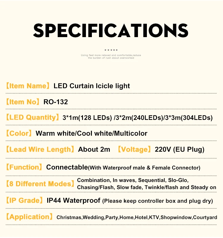 * Технические характеристики Наименование товара: Светодиодный светильник для занавесок Цвет: теплый белый/холодный белый/Разноцветный Количество СВЕТОДИОДНЫЙ: 3*1 м (128 светодиодный s) /3*2 м (240 светодиодный s) 3*3 м (304 светодиодов) Напряжение: 220 В (штепсельная Вилка европейского стандарта) Длина свинцового провода: около 2 м Функция: подключаемый (с водонепроницаемым штекером и разъемом) 8 различных режимов: комбинация, волны, последовательно, Slo-Glo, чеканка/вспышка, медленное выцветание, мерцание/вспышка и постоянное включение. Класс IP: IP44 водонепроницаемый (пожалуйста, держите блок контроллера и подключите сухой) Применение: Рождество, свадьба, вечерние, дома, гостиницы, KTV, окно магазина, внутренний двор. * Посылка 1 * Светодиодный Шторы сосулька светильник * Примечание 1. Из-за разницы между различными мониторами изображение может не отражать фактический цвет изделия. Мы гарантируем, что модель реального изделия не отличается от представленной на фото. Спасибо! 2. Этот светодиодный светильник для занавесок является водонепроницаемым, однако контроллер и вилка не являются.