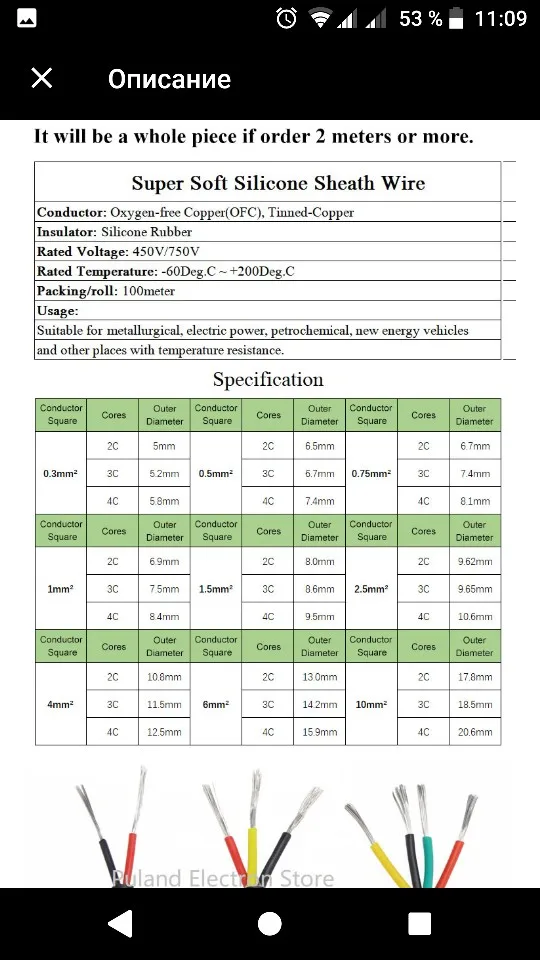 Провод с силиконовой изоляцией, выдерживает температуру 200+. Изоляция самих проводников тоже силикон, бумажная оплетка. Сечение честное, 0,5. 16 жил по 0.2мм каждая. Материал медь луженая. Сопротивление 0,032 Ом на метр. В целом отличные провода за эту цену. Немного более жесткие чем брендовые аналоги, но и стоит заметно дешевле.