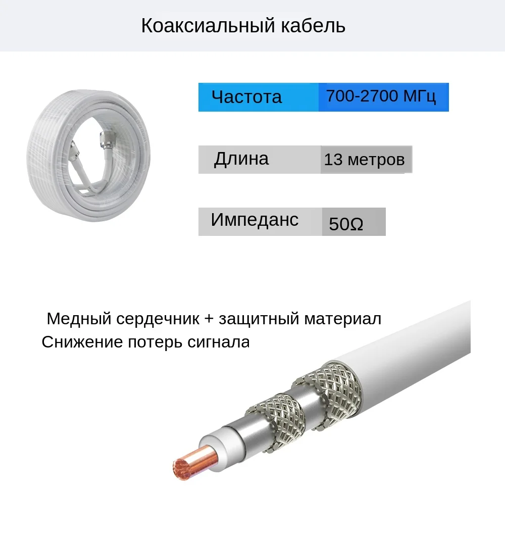 1. GSM 900 LTE 1800 3g WCDMA 2100 ретранслятор 2. Шнур питания переменного тока 3. Внутренняя антенна 4. Наружная антенна 5. 13 м кабель
