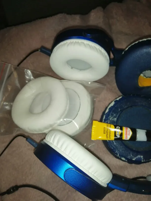 Подошло идеально, качество супер! В комплекте не было на что клеить, я клеила своим клеем, но можно и на двусторонний скотч наверное. У меня Soney mdr-xb550: амбушюры выбрала 75 мм. Покупкой довольна, рекомендую - только меряйте внимательно размер. Продавец молодец!
