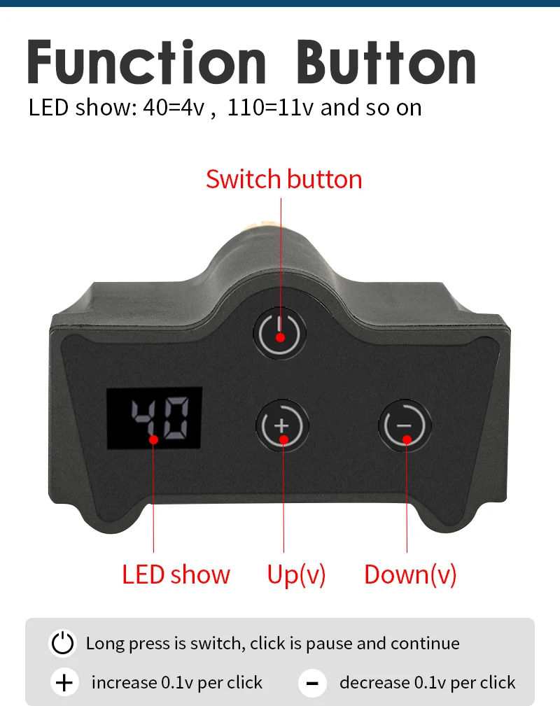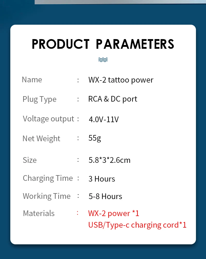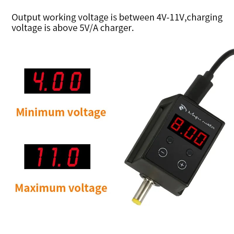 Выходное рабочее напряжение составляет от 4 в до 11 в, напряжение зарядки составляет 5 В/1 А или больше зарядного устройства (5 В зарядное устройство для мобильного телефона), время зарядки составляет около 3 часов, И моторная татуировочная машина может использоваться в течение 5-8 часов.