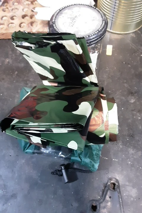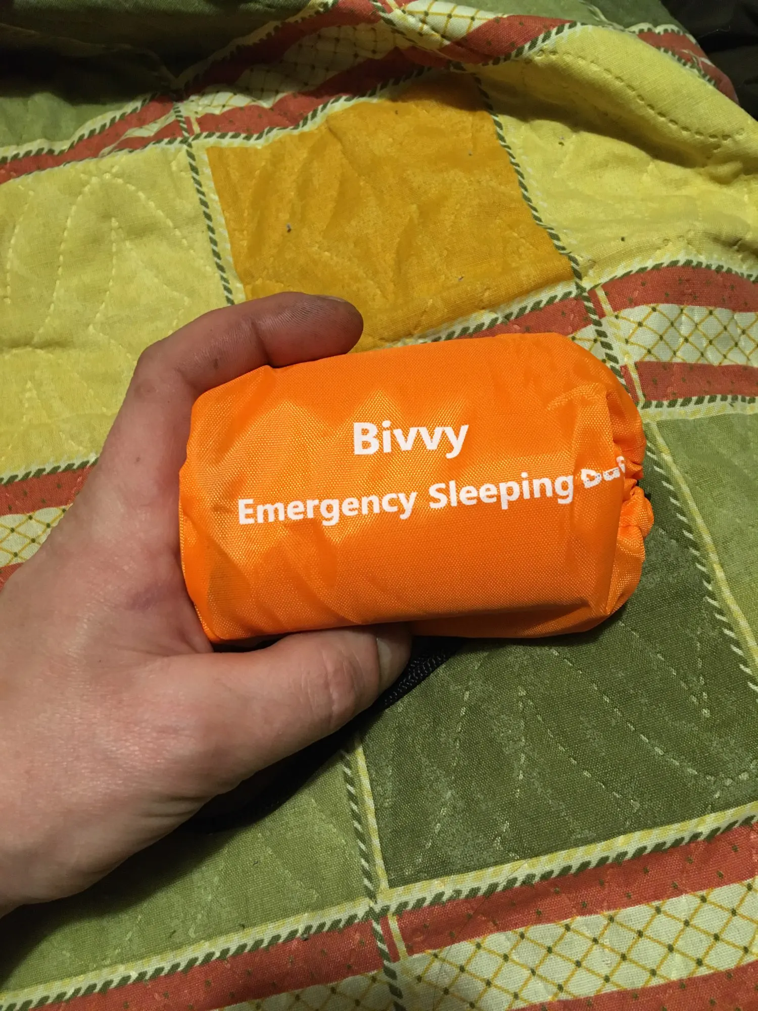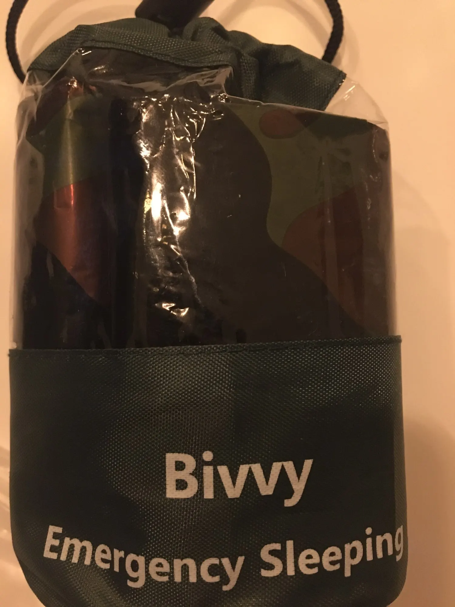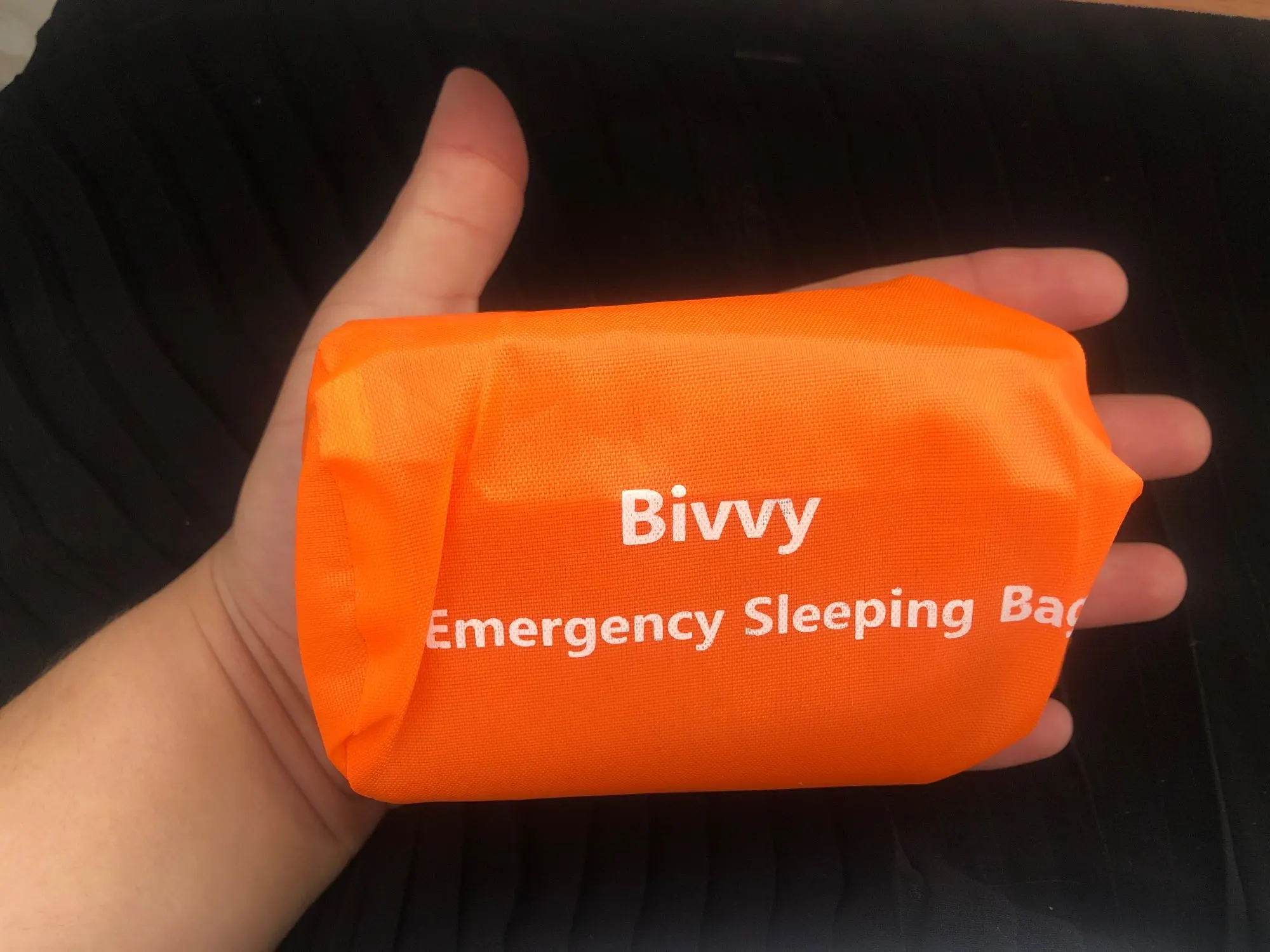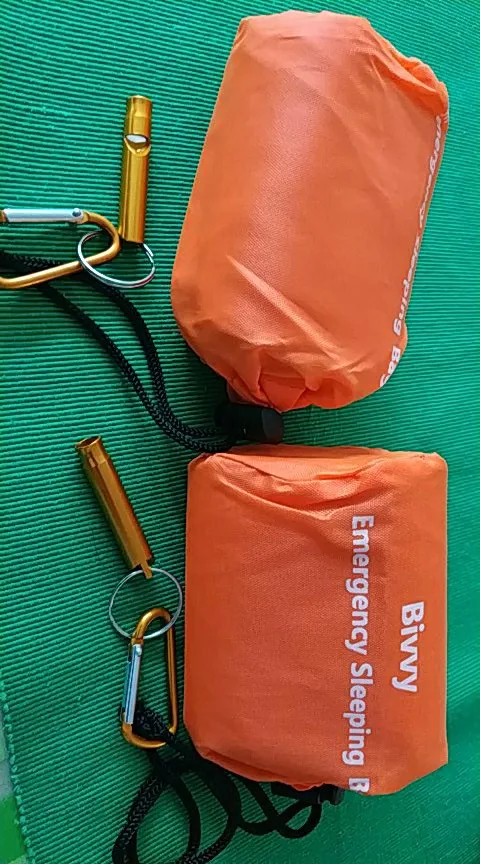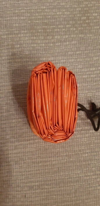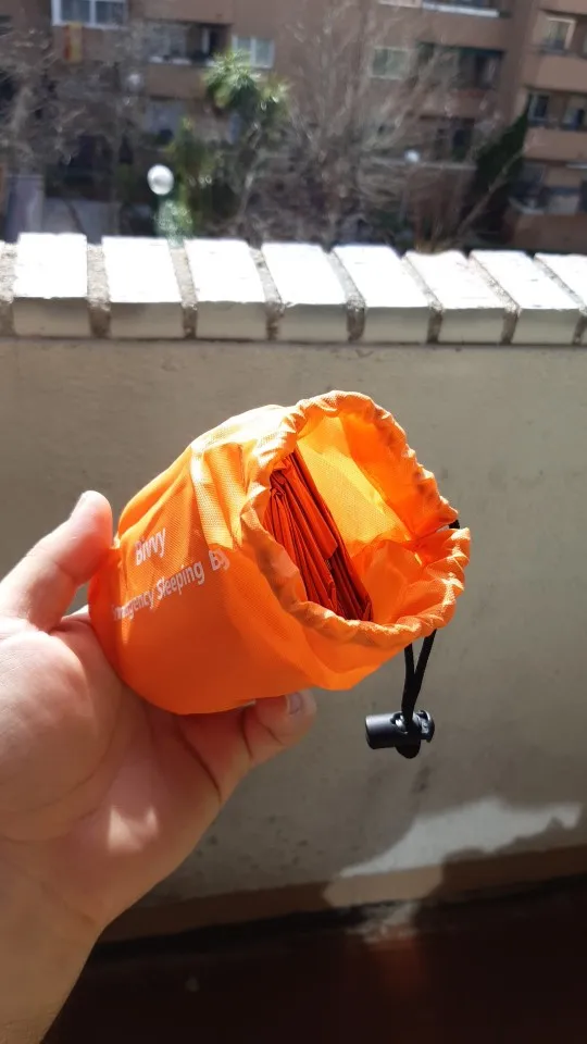 saco de dormir para emergencias. ocupa muy poco, por el lado exterior es de un tipo de plástico naranja que es impermeable y por dentro es del material de las mantas térmicas de emergencia. perfecto para una mochila de emergencias o llevar en el coche.