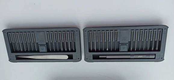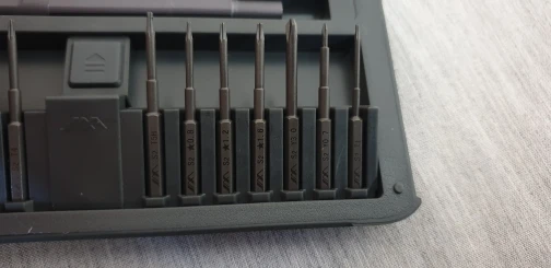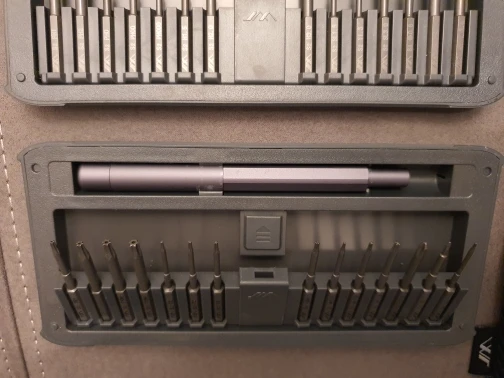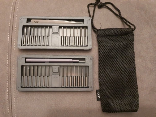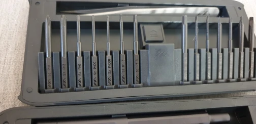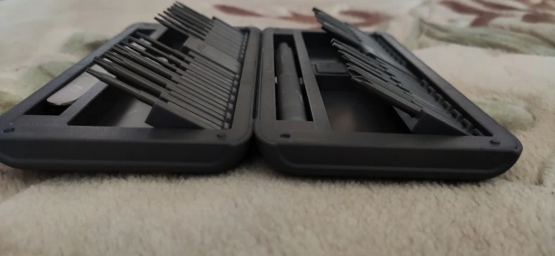 Набор дошел быстро, упакован в коробку из плотного картона почте сложно такую повредить. Первое впечатление очень положительное, но не ВАУ как от наборов Xiaomi. Однако со своей задачей справляется, брался из за длинных бит и это однозначно большой плюс. Кейс снаружи из софт-тач покрытия отпечатки остаются очень сильно. Внутри из более дешёвого пластика. Все держится на магнитах и кейс и биты, но магниты мощные. Так же в комплекте есть чехол.