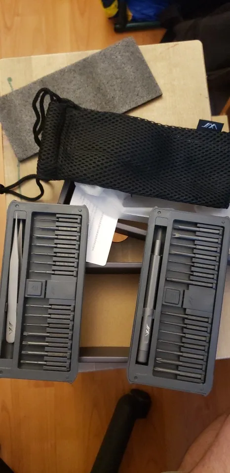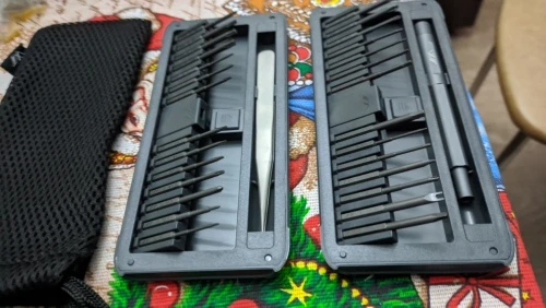 Отвёртки хорошие пинцет не плохой 1 минус это когда ыуляр потрусишь некоторые биты вылетают из пазов решил эту беду простой полетелен вырезал из под защитного стекла а в целом рекомендую доставка не отслеживалась по времени ишло 7 дней
