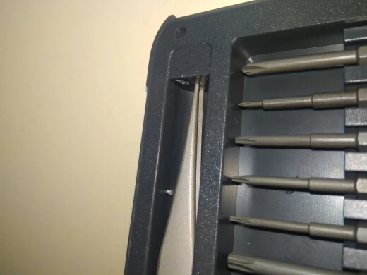 Доехал за неделю. Вау эффекта от набора конечно не было. Просто хороший набор. Выбрал из за длинных бит. Пинцет погнут, но это просто его уложили неправильно или просто много кидали пока везли. Надо уложить его так, что б носик вошёл в прорезь. Так он не болтается и носик пинцета не гнется