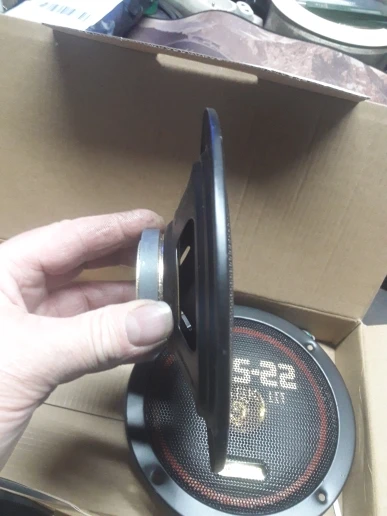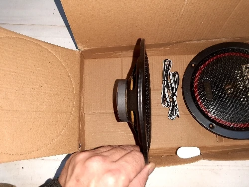 Коробка с динамиками была мятая, сетка на одном динамике мятая.