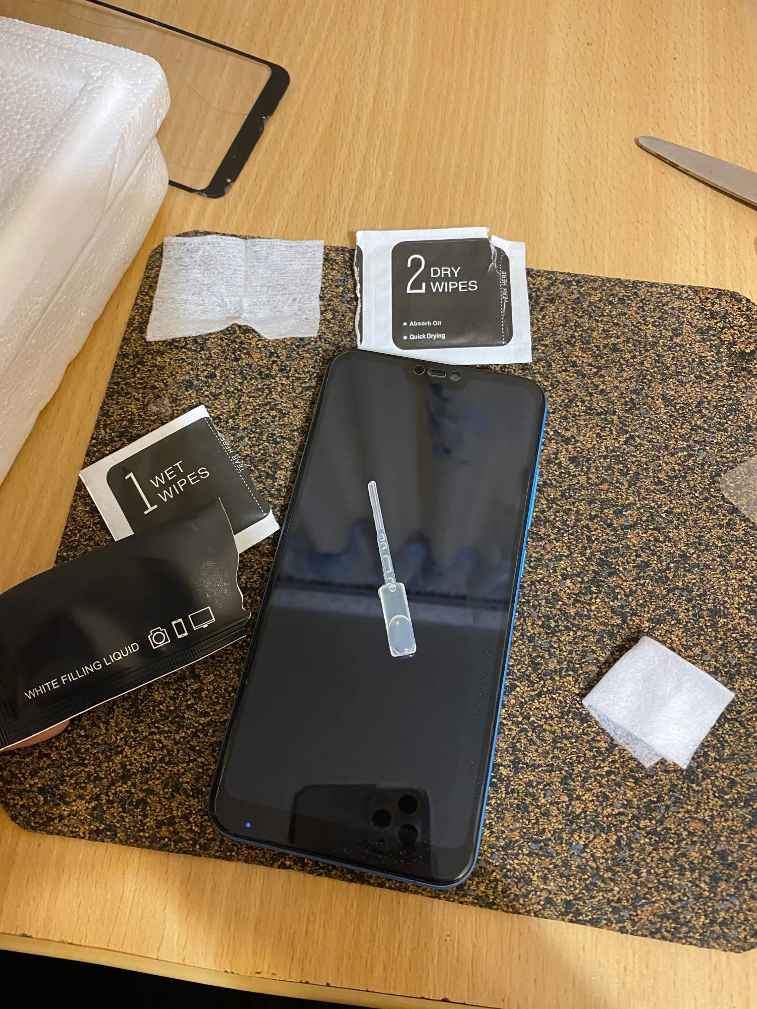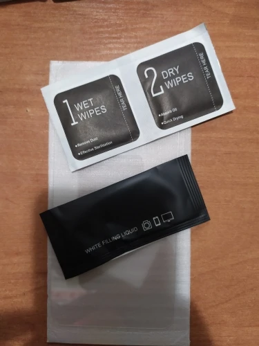 Доставка за месяц, несмотря на распродажу 11.11. Посылка пришла одной из первых из всех сделанных заказов на распродаже. Упаковано надежно. Внутри две салфетки, влажная для ужаления пыли и грязи с экрана, сухая для удаления жира и впитывания влаги. Также в наборе кисточка с силиконовым клеем для заклеивания пустот, которые иногда образуются по границе стекла после приклеивания