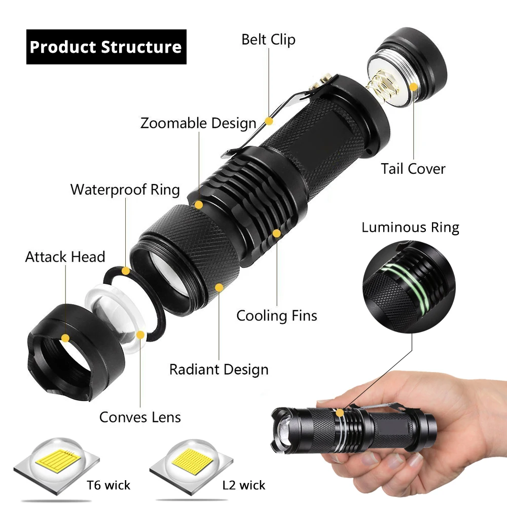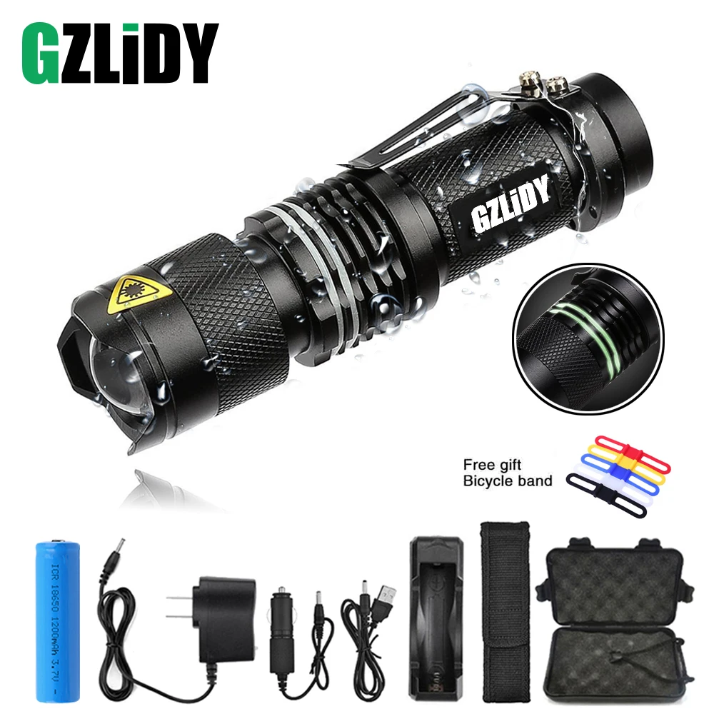 Супер яркий светодиодный фонарик с зумом L2, светодиодный фонарик с бусинами, 5 режимов, миниатюрный фонарик для кемпинга, водонепроницаемый, с аккумулятором 18650