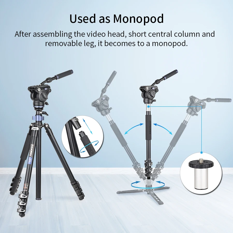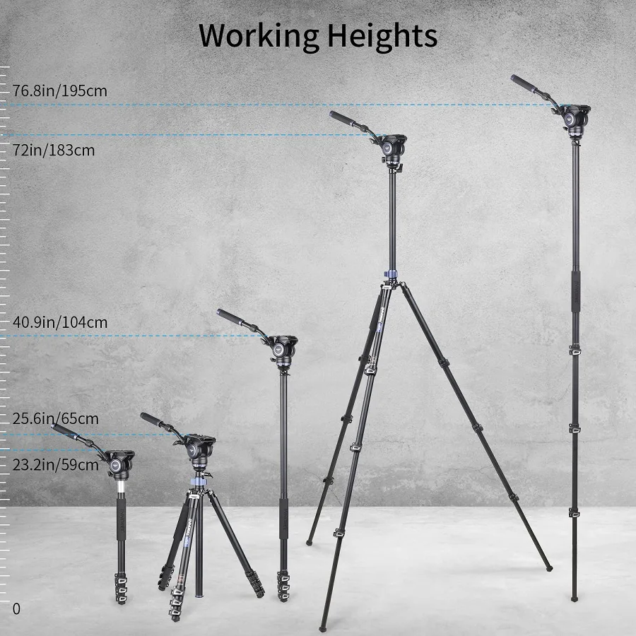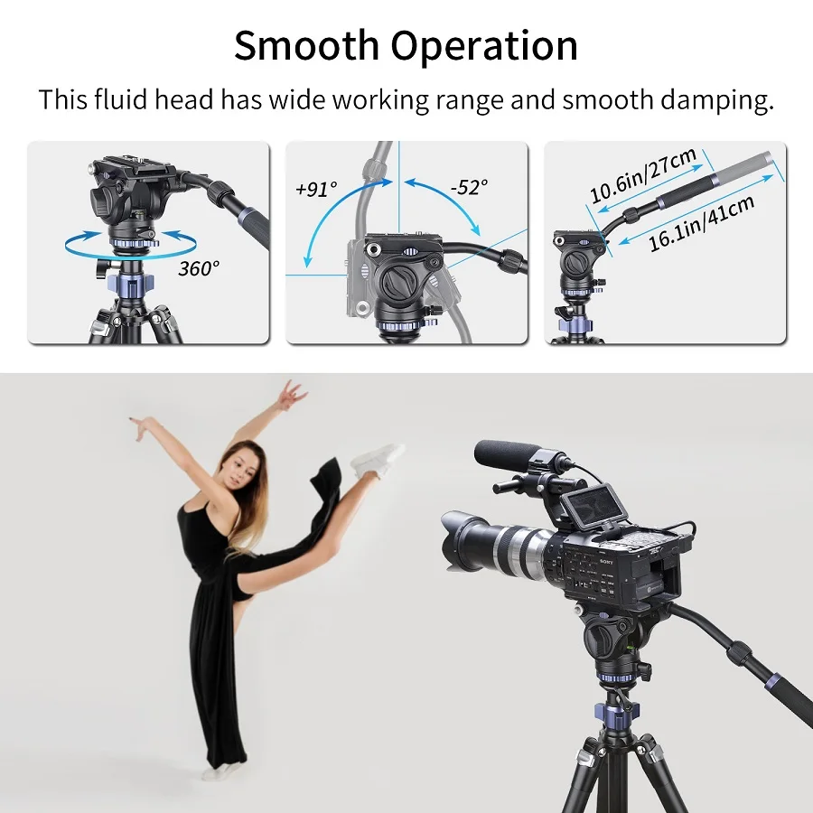【Быстрый дизайн защелкивающегося замка с защелкой этот видео штатив имеет быструю конструкцию защелкивающегося замка, что делает его удобным для регулировки разной высоты, как вы хотите, больше не нужно вращать рукав замка.【Полушаровая Чаша Дизайн 】-полушаровая платформа и полушаровая Блокировка рычага делают видео штатив выровненным быстро, что помогает вам легко снимать панорамные фотографии.【Выравнивающий центр колом】-Видео штатив прикреплен со встроенным полушариковым выравнивающим основанием, Центральная колонна и опорная планка могут наклоняться на 25 ° в любом направлении, чтобы решить проблему горизонтальной регулировки.【Многофункциональное использование 】-штатив легко преобразуется в монопод, сочетая короткую центральную колонку со съемной ножкой штатива, он особенно идеально подходит для макросъемки и съемки крупным планом.【Compact & Durable】-со складывающимися на 180 ° ножками, видео штатив можно легко сложить. Он изготовлен из легкий высокопрочный алюминиевый сплав, минимизируя вес, максимальная нагрузка составляет 20 кг по самой низкой цене, и масса нетто-2,1 кг. Этот компактный штатив подходит для DSLR установок, компактных видеокамер и цифровых кинокамер.【Наклонная головка панорамирования-с соединительным соединителем 3/8 "для аксессуаров, фиксация панорамной головки/наклона, предустановленное противовесом с отсоединяемой панелью фиксированной длины, предлагает панорамирование на 360 ° и наклон + 91 ° / -52 °. Плоское базовое крепление со стандартной резьбой 3/8 ''делает головку универсальной для большинства штативов, слайдеров, стрелок или крана.