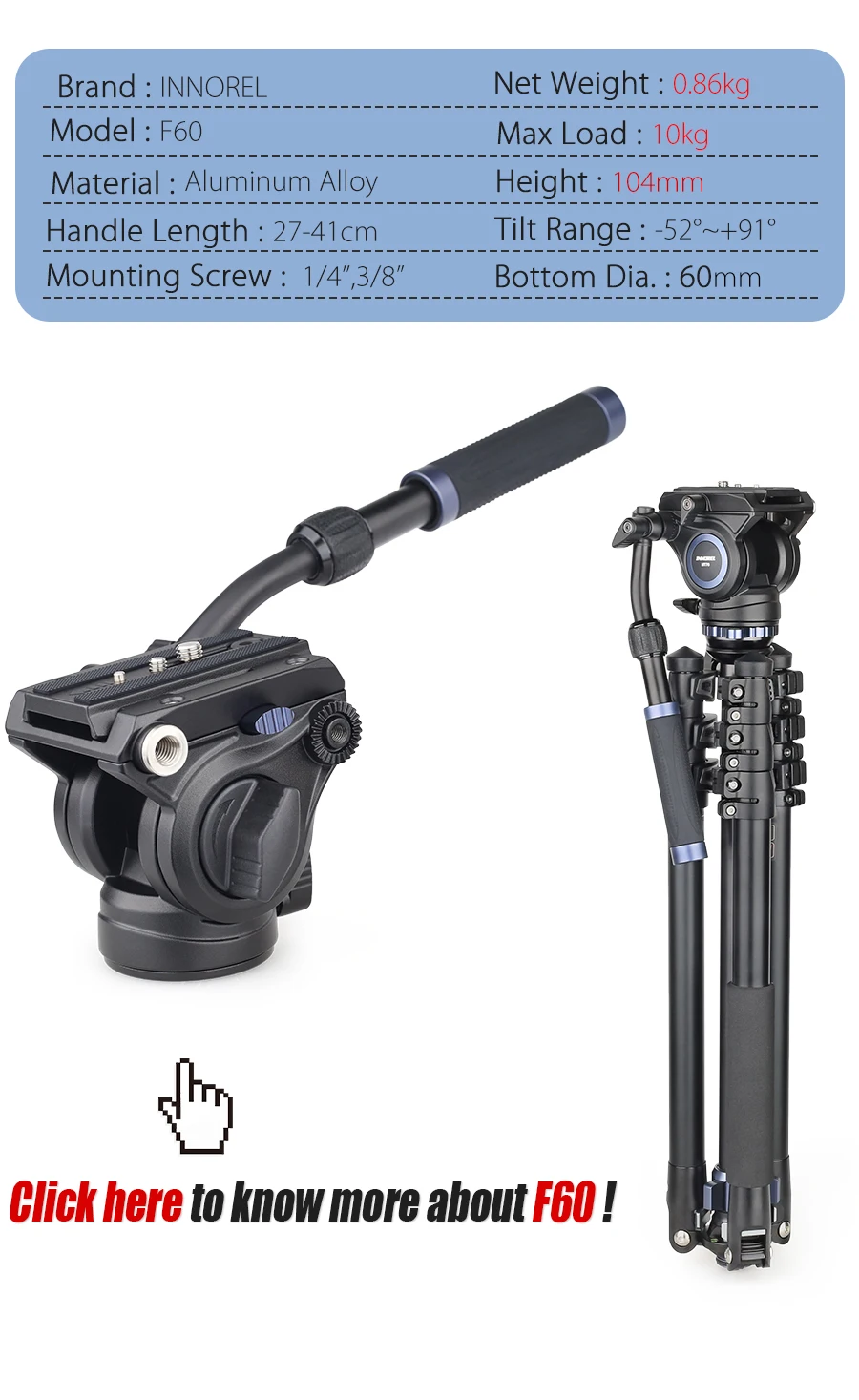 Вес нетто: 0,86 кг Максимальная нагрузка: 10 кгШаровое Основание: 60 мм Диапазон панорамирования: 360 °Диапазон наклона: от-52 до + 91 ° Уровень пузыря: ДаМонтажная Платформа: 1/4 ''и запасной 3/8 винт