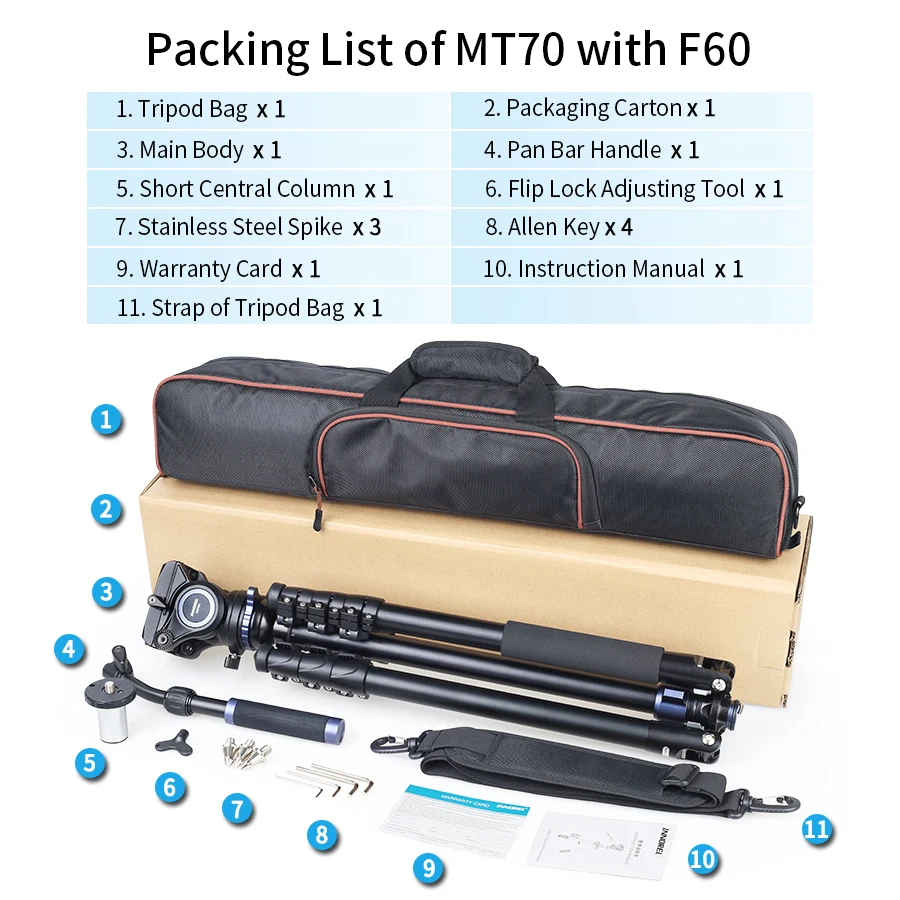 Штатив MT70 * 1 F60 головка жидкости * 1БЫСТРОРАЗЪЕМНАЯ пластина * 1 ключ * 2Сумка для переноски * 1 Инструкция * 1