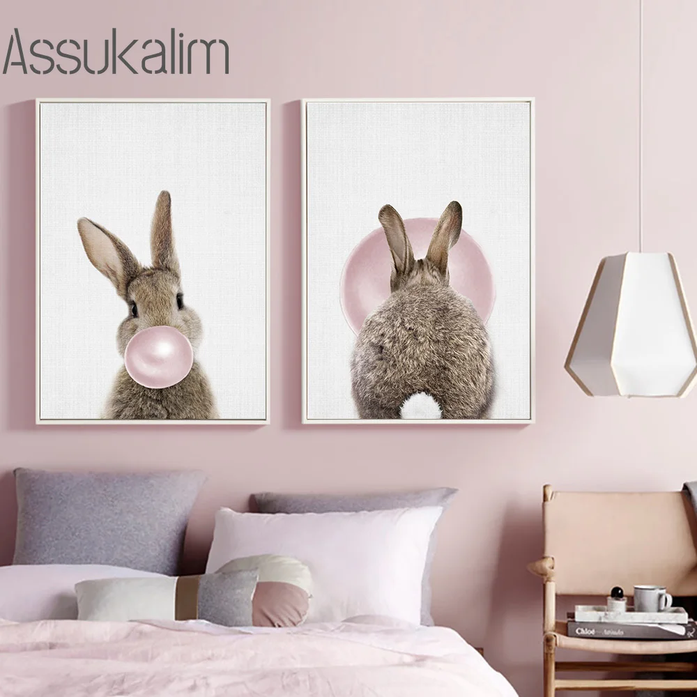Картины с изображением кролика, плакат с жевательной резинкой, розовые пузырьки, искусство, картина, настенные картины в скандинавском стиле, украшение для комнаты девочки