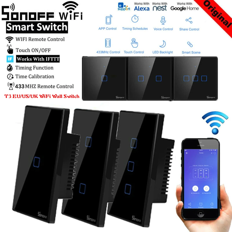 Умный настенный переключатель SONOFF T3EU/UK/US Wifi можно управлять удаленно с помощью телефона, а устройства, подключенные к переключателям, могут работать независимо. Работает с Amazon Alexa и Google Assistant, который позволяет включать или выключать ваши устройства с голосовой командой, идеально подходит для тех, кто должен обрабатывать много домашней работы одновременно. Небольшой кран для более легкого управления. Установите время для устройств, и переключатели помогут вам включить или выключить их автоматически. Портной смарт-сцена для ваших приборов. Просто установите событие, чтобы вызвать один SONOFF или группы устройств с помощью нажатия на вашем телефоне. Ваши устройства не будут работать из-за аномальной сети Wi-Fi, управление локальной сети, следовательно, разработано, чтобы убедиться, что они могут нормально работать. Примечание 1: SONOFF T3 EU/UK/US Поддерживает пульт дистанционного управления 433 МГц, рекомендуется использовать SONOFF RM433. Примечание 2: SONOFF T3 EU с каймой, не легко повредить.
