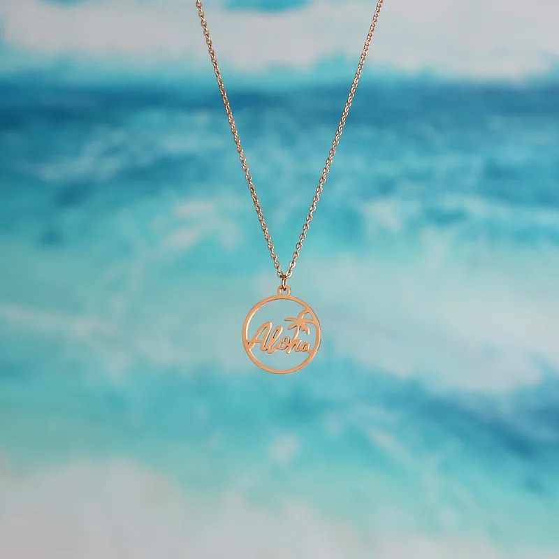 Тип изделия: кулон «ALOHA»Пол: женщин и мужчинТип цепи: звенья цепиМатериал: нержавеющая стальДлина цепочки: 45 см + 5 смРазмер подвески: 20 ммСтиль: Модный