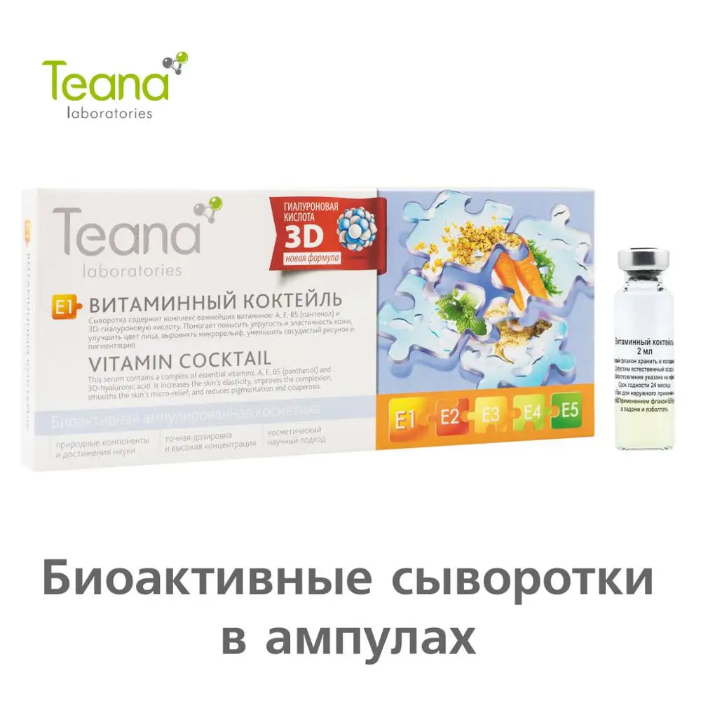 Teana Витаминный коктейль, сыворотка для лица с гиалуроновой кислотой, улучшает цвет лица, уменьшает морщины, питает кожу 10x2мл