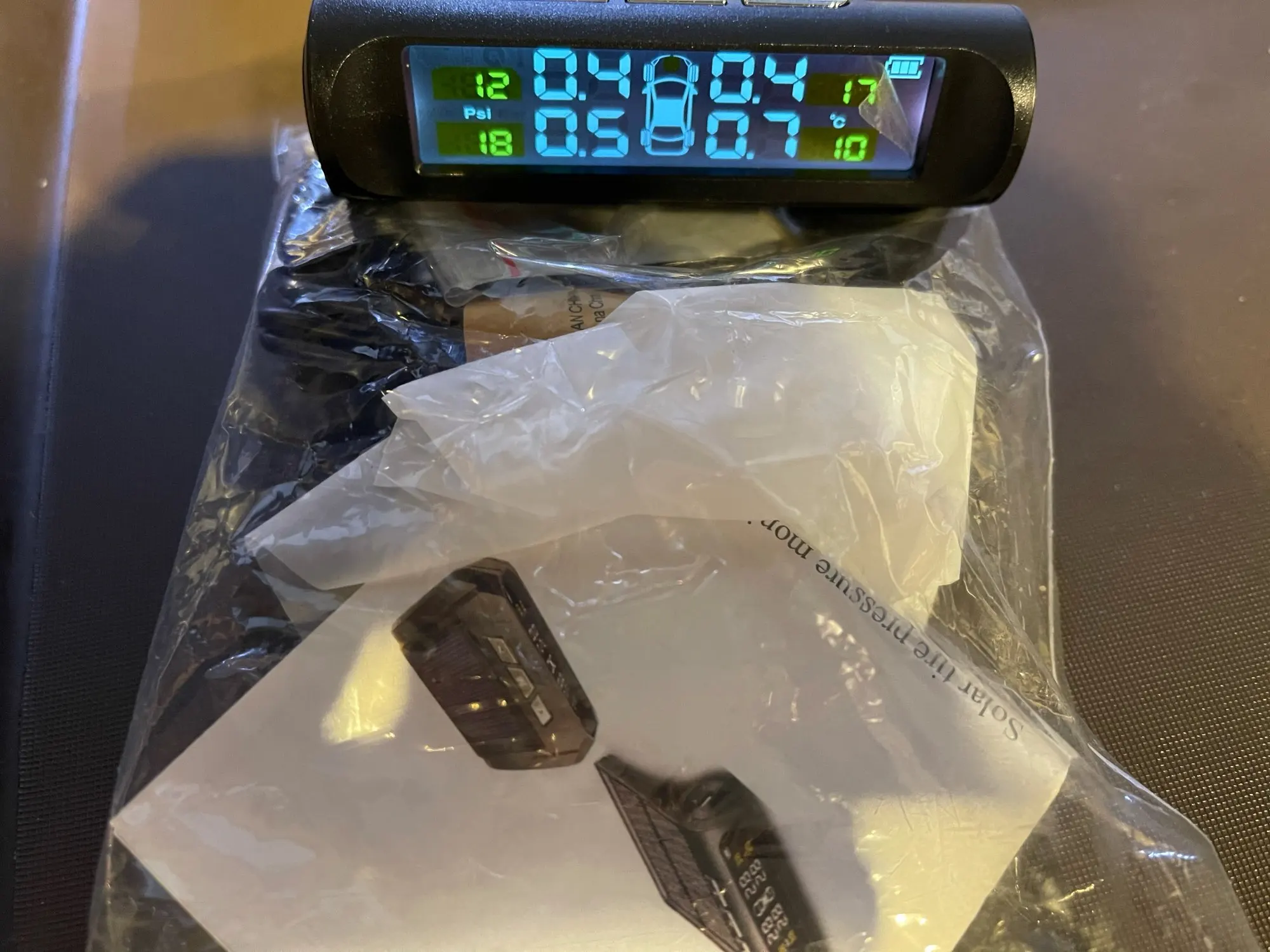 Посылка дошла быстро.Спасибо продавцу. Но есть один минус. Датчик один не показывает давление даже после замены элемента питания.