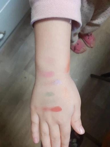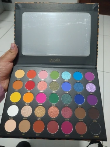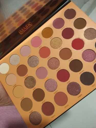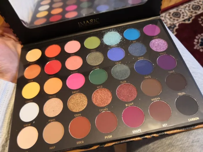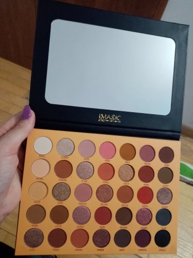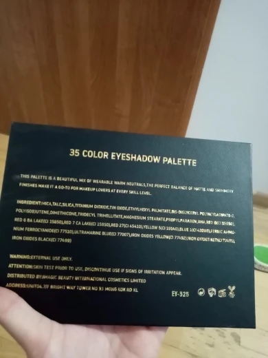 Отличный товар, пришёл в течении 10 дней в Москву, принёс курьер до квартиры. Одна из теней рассыпалась немного, видимо плохо спресовалась, но для меня это не критично. Пигментация замечательная, блёстки лучше наносить пальцем, потому что на кисть не берутся. Красные тени у меня даже не разу смылись. Раздражения на коже не было