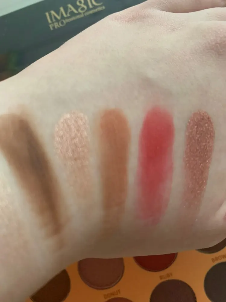 Не смотря на хорошую упаковку, один цвет немного разбился. Но это не вина продавца, вина почты. Тени хорошие. За день не скатываются, не собираются на веке. Держатся целый день, как накрасила так выглядят до вечера. Не сыпятся! Хорошо набираются на кисть и так же отдаются. Лучше брать натуральную кисть. Не смотря на приглушённые цвета на палетке, они выглядят ярче на глазах. Я довольна заказом! Довольна качеством!
